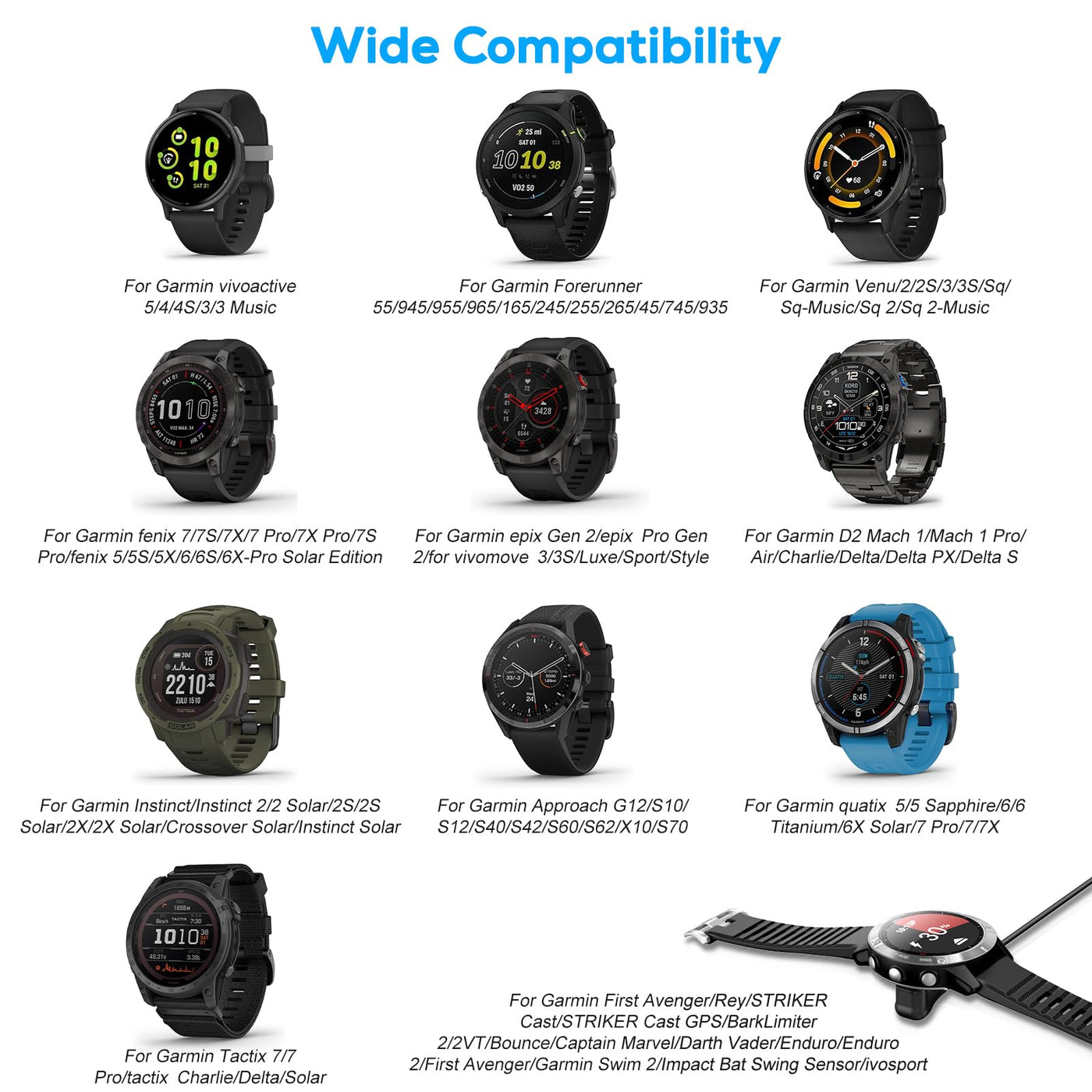 - Q: Is the charging cable compatible with all Garmin smartwatches? A: This charging cable is compatible with a wide range of Garmin smartwatches, including Fenix 7, 7S, 7X, 6, 6S, 6X, Forerunner 245, 945, Instinct 2, Vivoactive 4, and many more. For a complete list of compatible models, please refer to the product description.