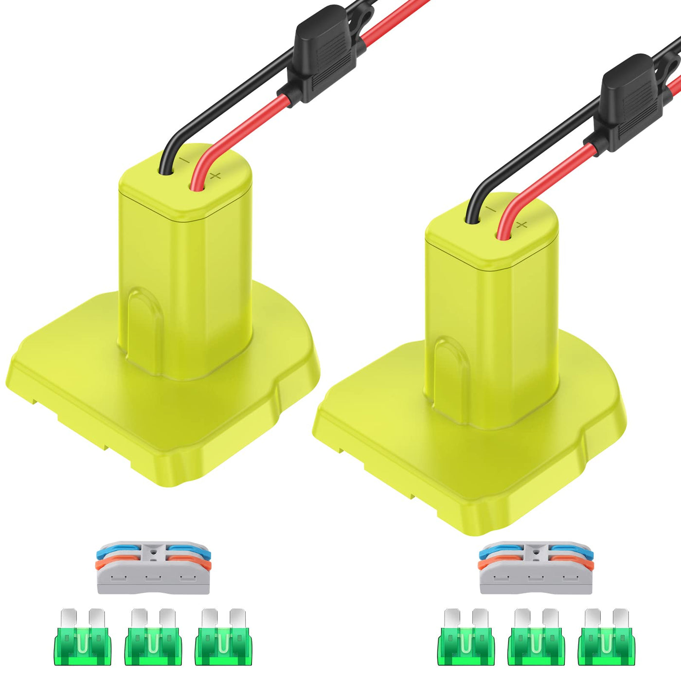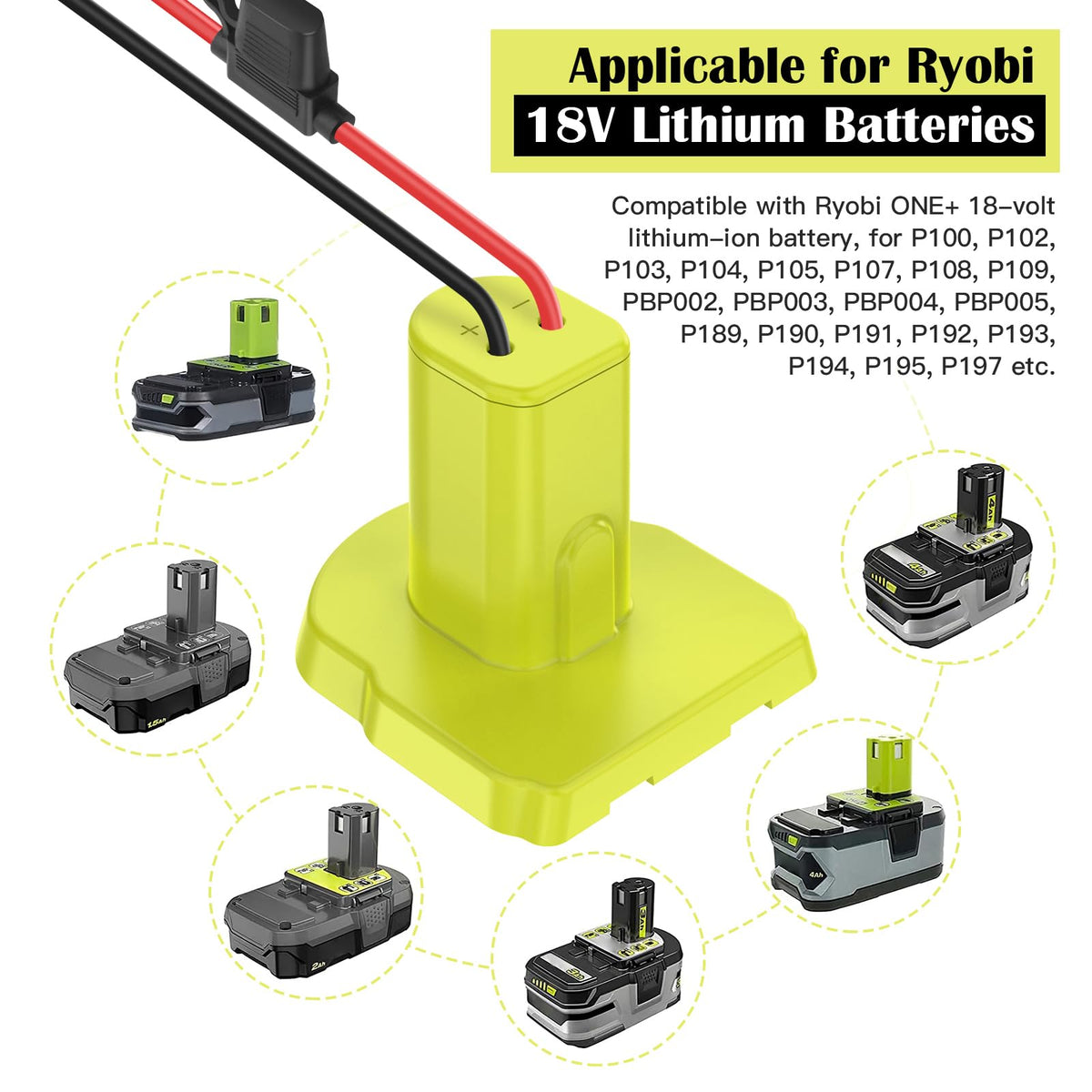 Newly Power Wheel Adapter Made Of Durable Abs Plastic, Injection-Molded, Excellent Scratch&Shock Resistance And Chemical Resistance And Is Impervious To Heat, Moisture, And Corrosion, Perfect For Indoor And Outdoor Use.Battery Adapter Compatible With Ryobi One+ 18-Volt Li-Ion Batteries (P102, P103, P104, P105, P107, P108, P109, Pbp002, Pbp003, Pbp004, Pbp005, Pbp006, P189, P190, P191, P192, P193, P194, P195, P197, Bpl-1820G, Bpl-1815, Bpl-18152 Etc.) Our Power Converter Is Well-Made, Snug Fit Your Battery, Install And Lock Your Battery Easily.Has Some Security Design. Equipped With 30Amp Fuse Protects The Battery Equipment From Being Damaged By Excessive Power. High Quality Silicone Copper Wire, Heat Resistant 12 Awg Wire Is Suitable For High-Power Applications. In Addition We Equipped 2 Wiring Terminals, Convenient For You To Connect The Power Cord Of The Device With The Power Cord Of The Adapter Faster And Better.Power Wheels Adapter Has 12 Gauge Wire Installed, Maximum Permissible Current 20A, Provides Enough Power Upgrade Your Power Tools, Ride On Toys, Work Lights Or Robotics Diy. Will Allow You To Quickly And Safely Upgrade Your Power Wheel, Enjoy The Beauty Of Diy At Your Spare Time Or When You'Re Accompanying Your Children.Note:1. This Converter Is Not A Charger, It Only Outputs The Voltage And Power Directly From Your Battery.2. The Red Wire Is Connected To The Positive Terminal, Black Wire Is Connected To The Negative Terminal. When Using, The Two Wires Shouldn'T Be In Contact.3. If Not Used For A Long Time, Please Be Sure To Remove The Battery Form The Adapter.Package Content:2 X Power Wheels Adapters6 X 30Amp Fuses2 X Wire Terminalsif You Have Any Problems For The Items, Please Contact Us Immediately To Get The After-Sale Return And Exchange Service We Provide.