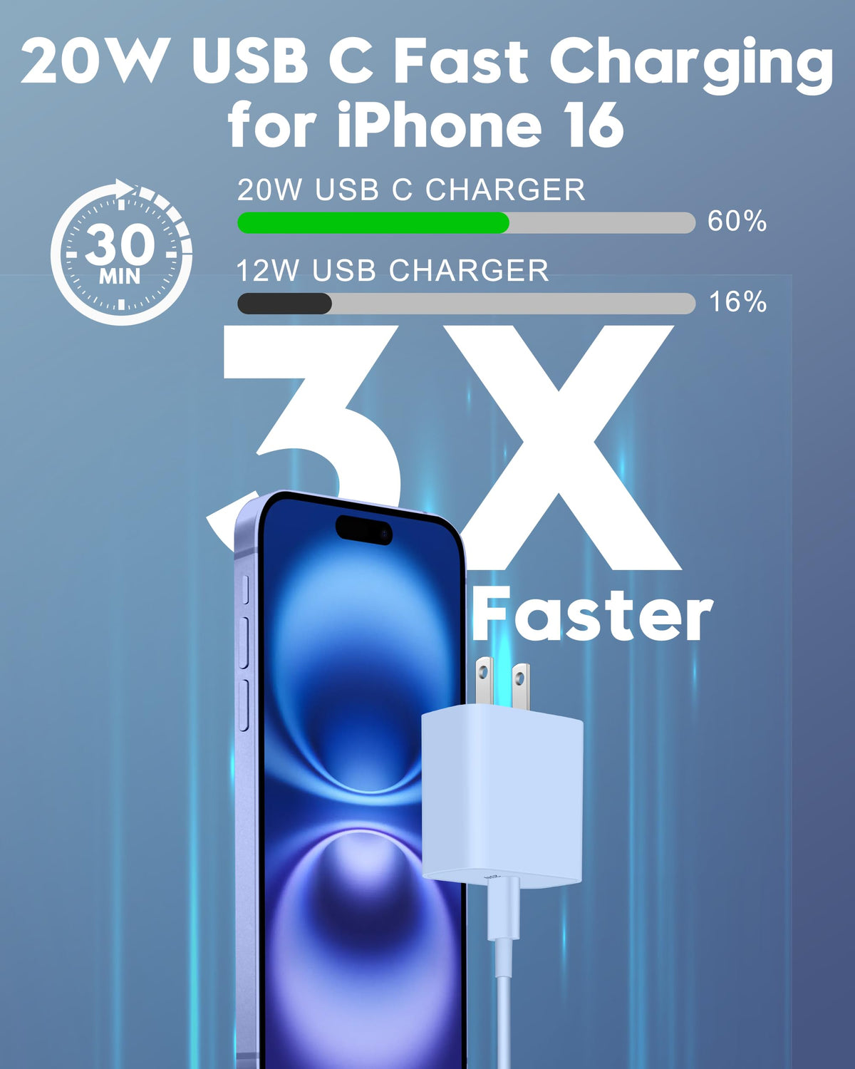Q: How quickly can I charge my iPhone 16 with this charger?A: Using the 20W Fast Charger, you can charge your iPhone 16 from 0 to 60% in just 30 minutes, thanks to its efficient power delivery technology.