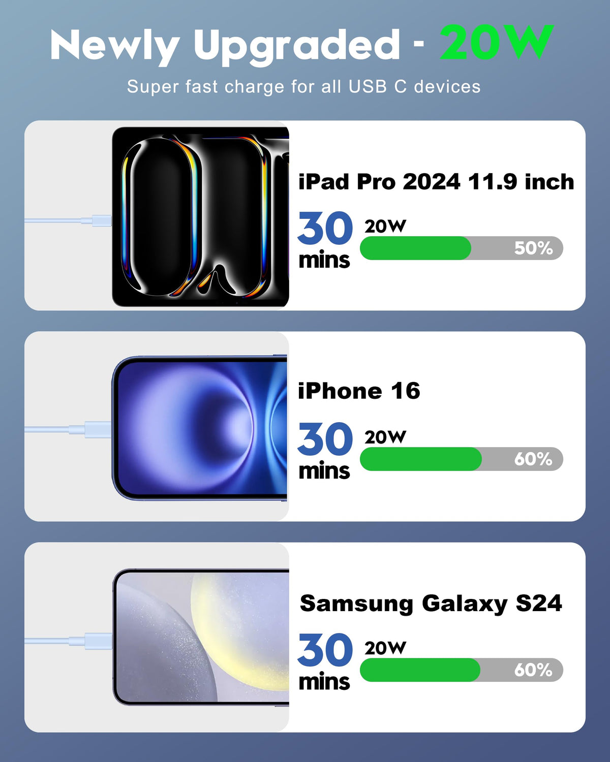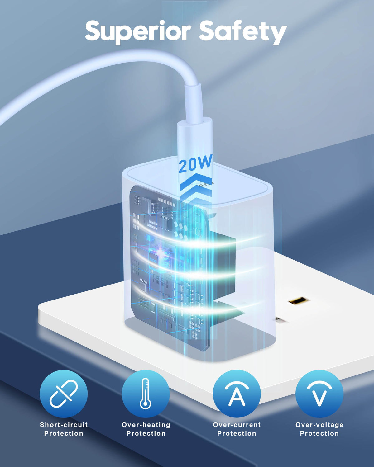 Q: Is the charger safe to use with my devices?A: Yes, the 20W USB C Charger features a built-in multiple protection system designed to prevent over-voltage, over-charging, and overheating. It is equipped with upgraded smart chips that match the required current for your devices, ensuring safe and stable charging.