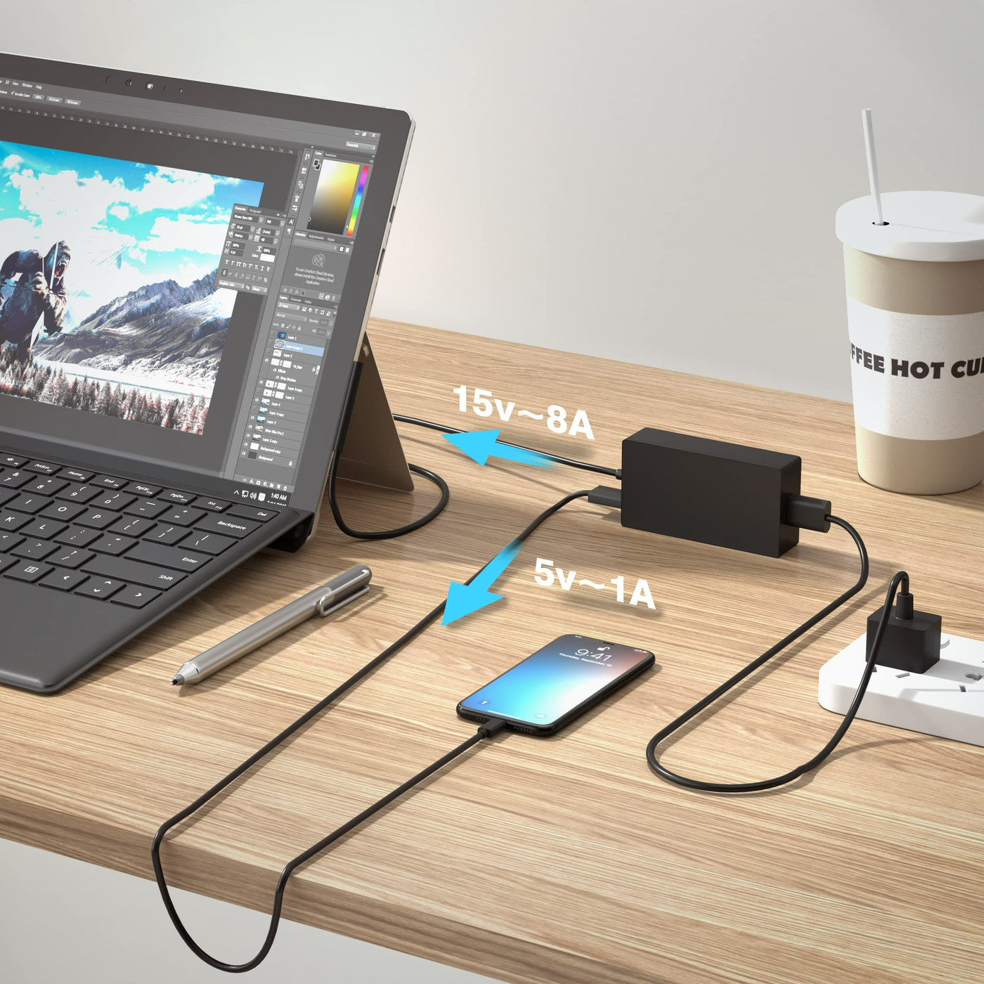 Specification:Input(Ac): 100-240V 50/60 Hz. Output(Dc):15V-4A 65W. Usb Port: 5V-1A 5W(For Cellphones) Dimensions: Power Supply: 3.54 X 1.97 X 0.98 Inch Ac Cord: 6.2Ft Dc Cord: 5Ft Weight: Power Supply With Power Cord Cable: 8.07 Ounces Surface Pro Charger 65W, Microsoft Surface Pro Laptop/Tablet Charger, Compatible With Surface Laptop Studio Surface Laptop 4 Surface Pro 8 Surface Laptop Go Surface Pro X Surface Pro 5 Surface Go Surface Go 2 Surface Laptop 3 Surface Pro 7 Surface Pro 4 Surface Go 3 Surface Laptop 2 Surface Pro 6 Surface Pro 3 Surface Laptop Surface Book 2 Surface Book