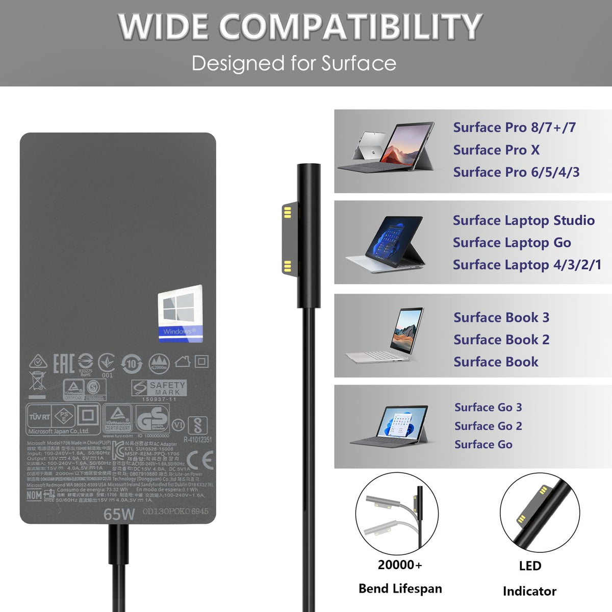Marsdock Surface Pro Charger Support 65W, 44W, 39W, 36W, 24W, Led Indicator Cable, Powerful Magnetic Plug, Keep Battery Health Widely Compatibility: Compatible With: Microsoft Surface Pro 9, 8, 7+, 7, 6, 5, 4, 3, X Windows Surface Laptop 5, 4, 3, 2, 1, Surface Laptop Studio Surface Book 3, 2, 1, Surface Go 3, 2, 1 Model: 1706, 1866, 1824, 1796, 1769, 1724, 1625, 1631, 1735, 1736, 1943, 1867, 1798, Etc. Excellent Performance: Original Quality: Ensure The Charging Stability And Safety, No Error Message Popping Up Superior Safety: Built-In Multi Safeguards To Protect Against Overcharging, Overheating, Short Circuiting Keep Battery Health And Reduce Battery Aging: Built-In Original Dynamic Software And Hardware Systems To Keep Maximum Battery Capacity To 98%, Intelligently Learning Your Daily Charging Routine To Reduce Battery Aging Super Slim: Portable For Travel 10Ft Super Long Cable: Let You Can Charge And Have Fun In Bedroom, Sofa, Library, Office, Even When You Are On The Backseat Of The Car