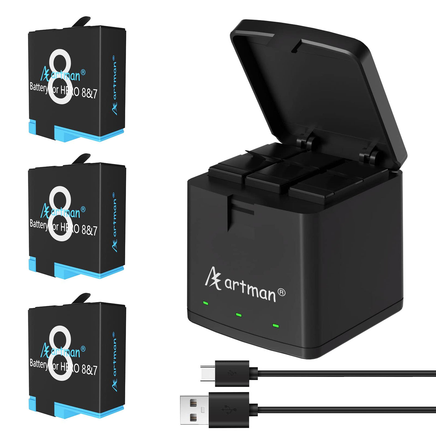 Artman Hero 8 Battery 1500Mah(3Xpack) And 3-Channel Led Usb Storage Charger For Gopro Hero 8 Black,Hero 7 Black,Hero 6/5 Black,Hero 2018(Fully Compatible With Gopro Hero 8 Battery And Hero 8 Charger)