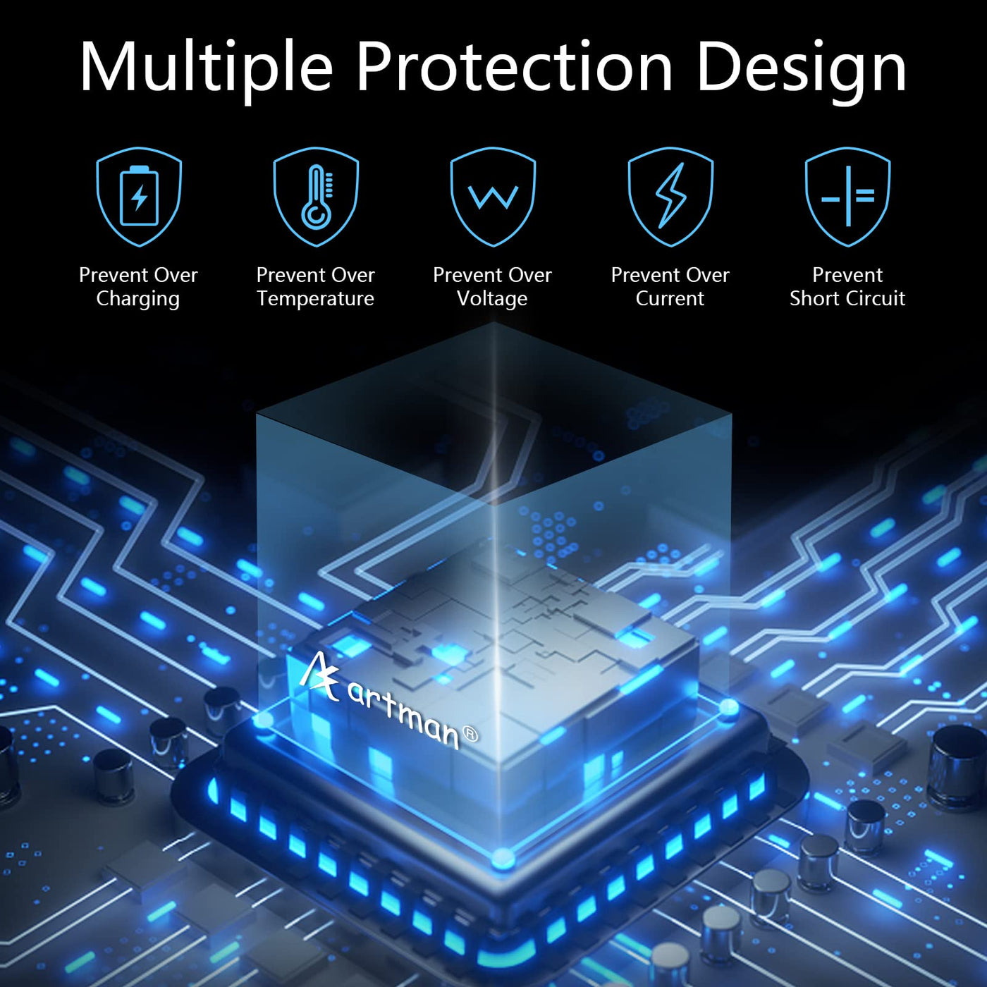 Q: What safety features does the Artman Battery Charger offer?A: The Artman Battery Charger includes six layers of protection, such as over-charging, short-circuit, high-temperature, and surge protection, ensuring safety for both you and your devices.