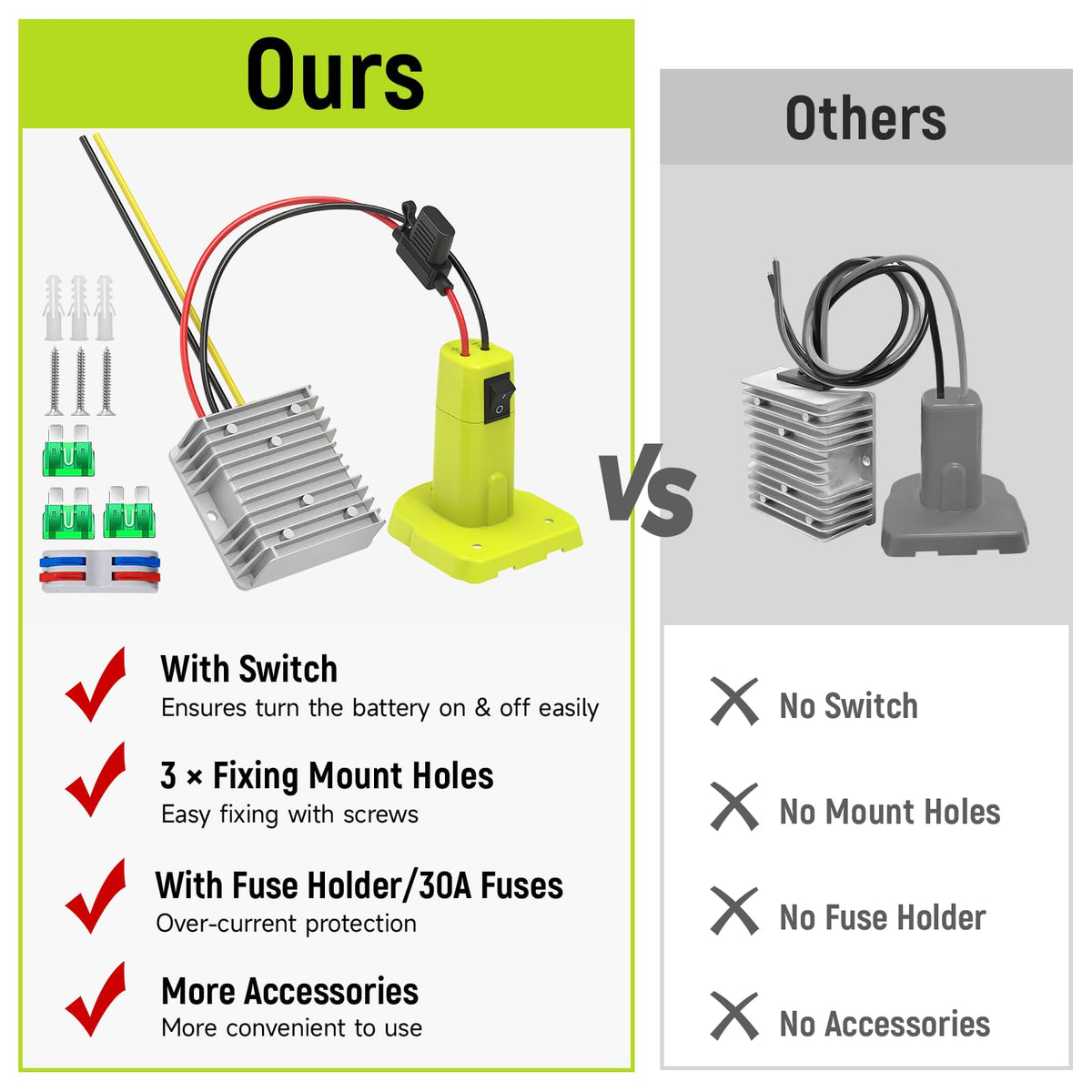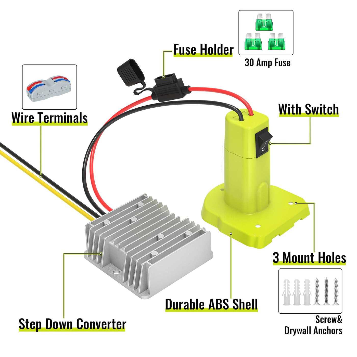 18V To 12V Step Down Converter Compatible With Ryobi 18V Battery Adapter, Voltage Converter Dc 12V 15A 180W Buck Converter Regulator, Power Wheel Adapter With Switch, 30A Fuse & Wire Terminal