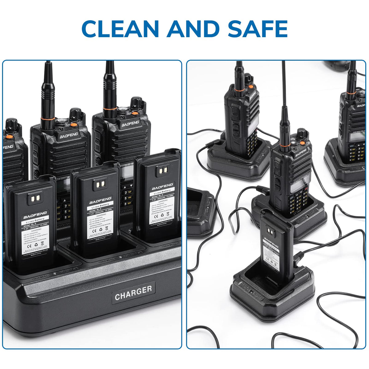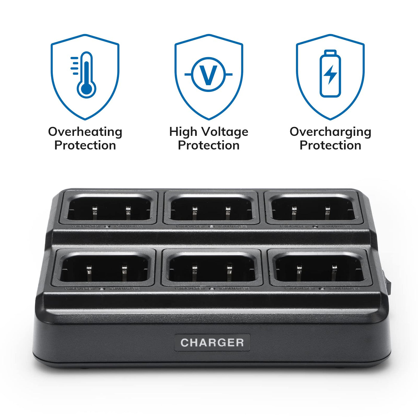 [Space Saving] This Is A Good Choice If You Are Eager To Save More Space For Multi-Device Charging. One Desktop Six-Way Charger For One Outlet Would Meet The Charging Needs Of Six Radios. Reserve More Outlets And Space For Other Electronics. Handy Size: 11.0*7.0*2.4 Inch. [Charging Protection] Charging Current : 500Ma(Per Pocket). Dc 8.4V, 100-240V. We Insist On Using Safe And Reliable Materials To Provide Multiple Protection For Charging. No Worry About Overcharging, Overvoltage, And Short Circuits. Radio Charging In Normal Scenarios Is Safe. [Compatible Models] The Six-Way Desktop Charger Will Work Well For Baofeng Two Way Radios Such As Uv-9G, Gt-3Wp, Uv-9R, And Uv-9R Plus. Charge 6 Radios Or Batteries At The Same Time. Full Charge For Bl-9 1800Mah Battery: 3-4 Hrs. Fast Charging Ensures Long-Lasting Communication. [Power Switch] With A Power Switch On The Side Of The Base, You Can Use The Switch To Turn Off The Power When You Are No Longer In Use. No Need To Pull The Plug Out Of The Outlet, Feel Free To Leave The Charger On The Desktop. Convenient And Easy To Use. [Whats In The Box] 1 X Six-Way Charger, 1 X Removable Ac Adapter. The Power Button Is On The Side Of The Base. You Can Turn Off The Charger Instead Of Unplugging It.