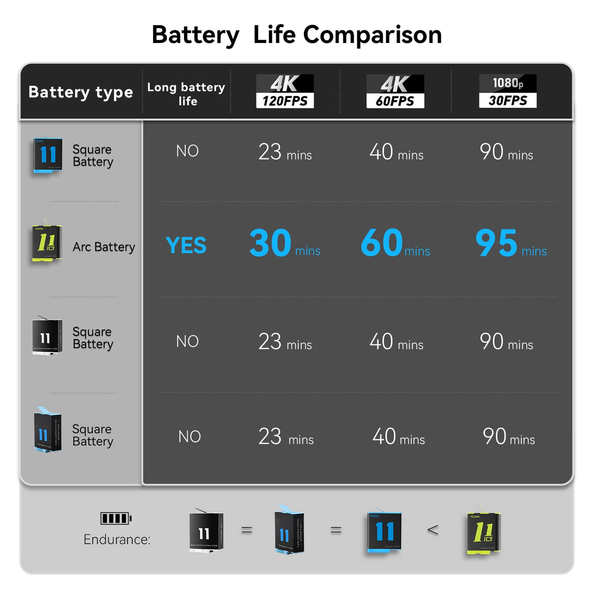 Q: How long does it take to charge the batteries using the TELESIN charger?A: The TELESIN charger can fully charge three batteries simultaneously in approximately 2.5 hours. Individual charging times are about 50 minutes for one battery, 90 minutes for two batteries, and 150 minutes for three batteries.