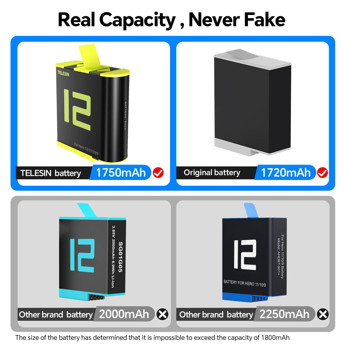 Q: What is the capacity of the TELESIN replacement batteries?A: Each TELESIN replacement battery has a capacity of 1750mAh, allowing for extended usage times with your GoPro camera.
