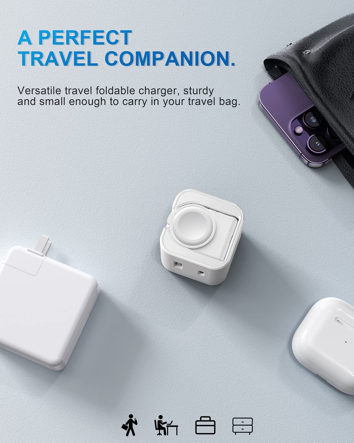 Q: Is the BeaSaf charger travel-friendly?A: Yes, the BeaSaf charger is designed with a compact and double-fold design, allowing both the iWatch charger and prongs to fold flat. This makes it ideal for travel as it fits easily in your pocket or luggage without taking up much space.
