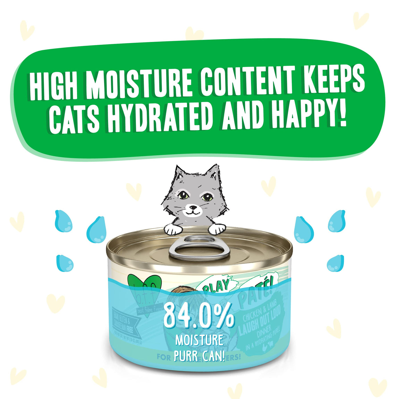 Q: How does this cat food help with hydration?A: With over 82% moisture content, B.F.F. Play helps keep your feline friend hydrated, which is essential for their overall health and well-being.