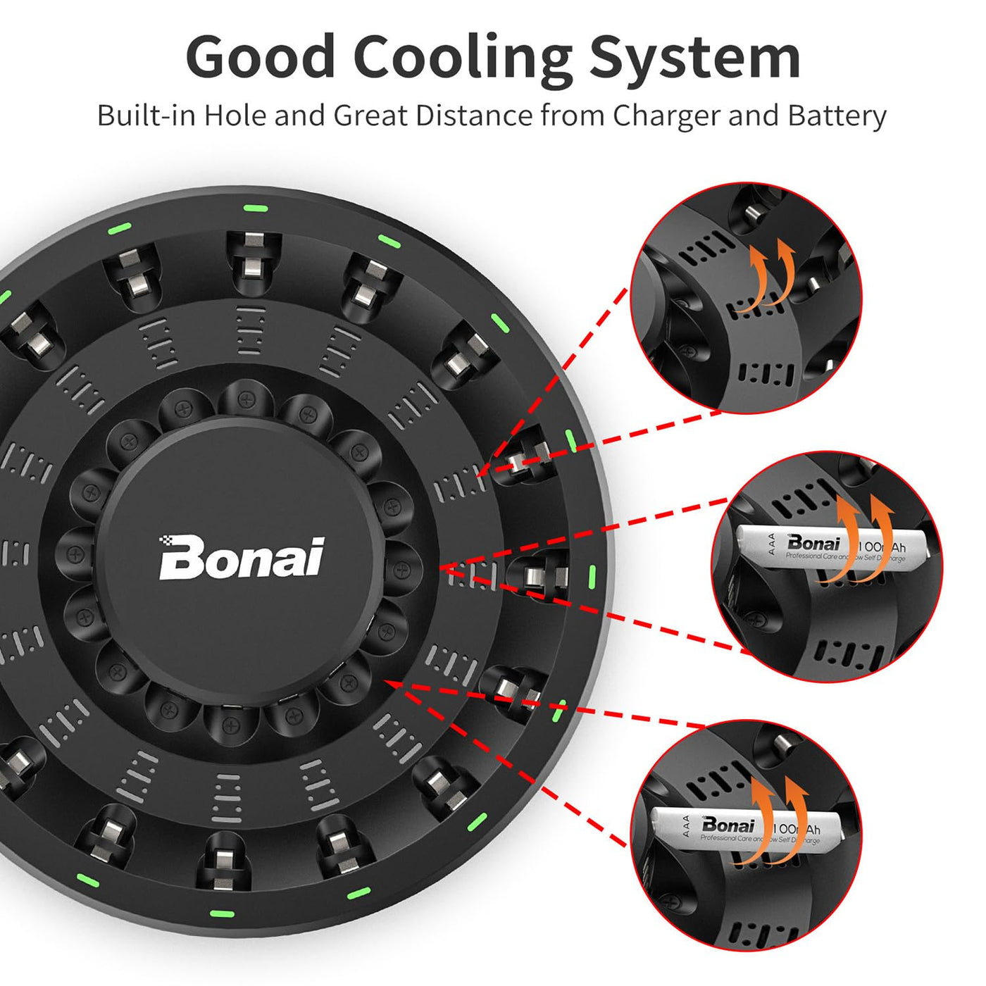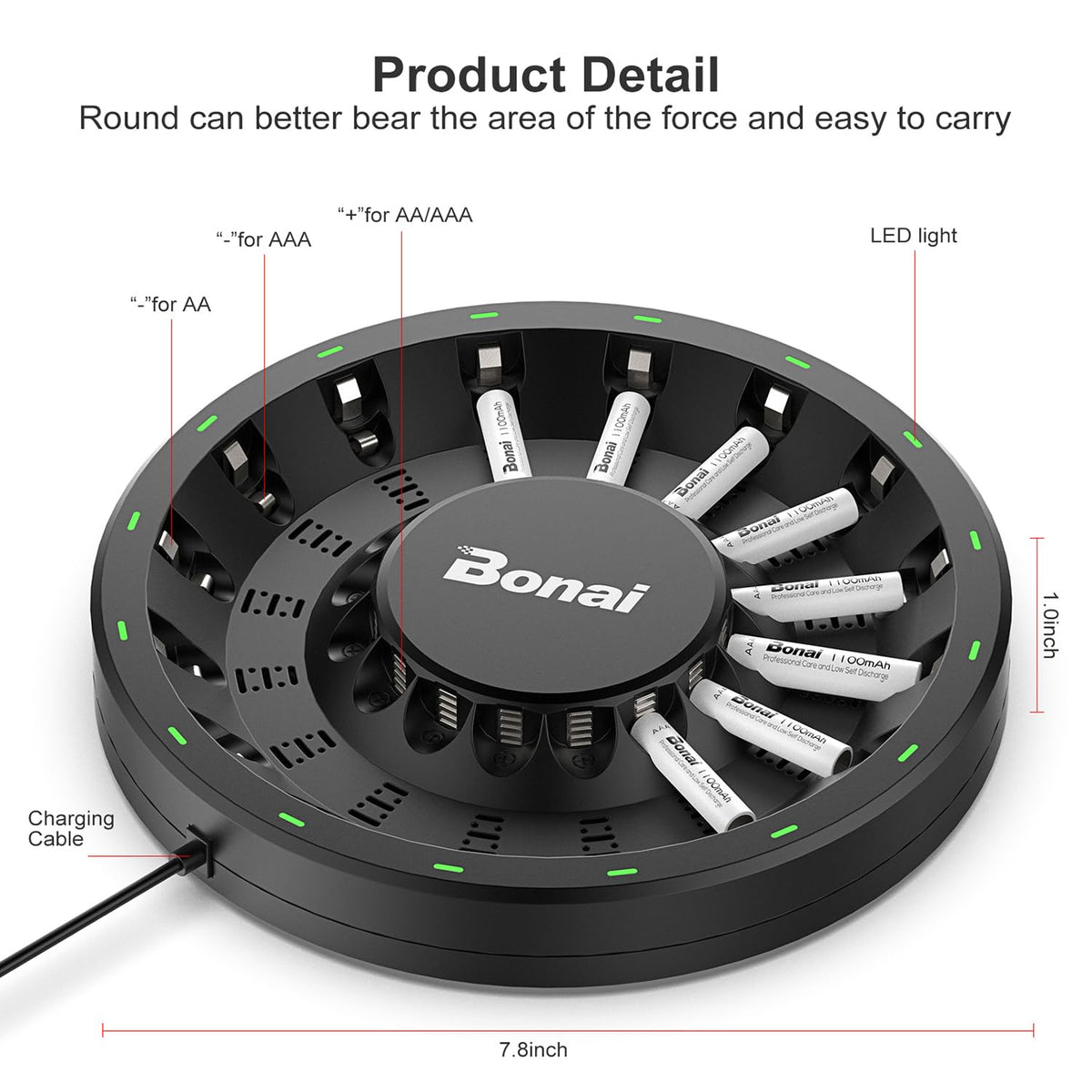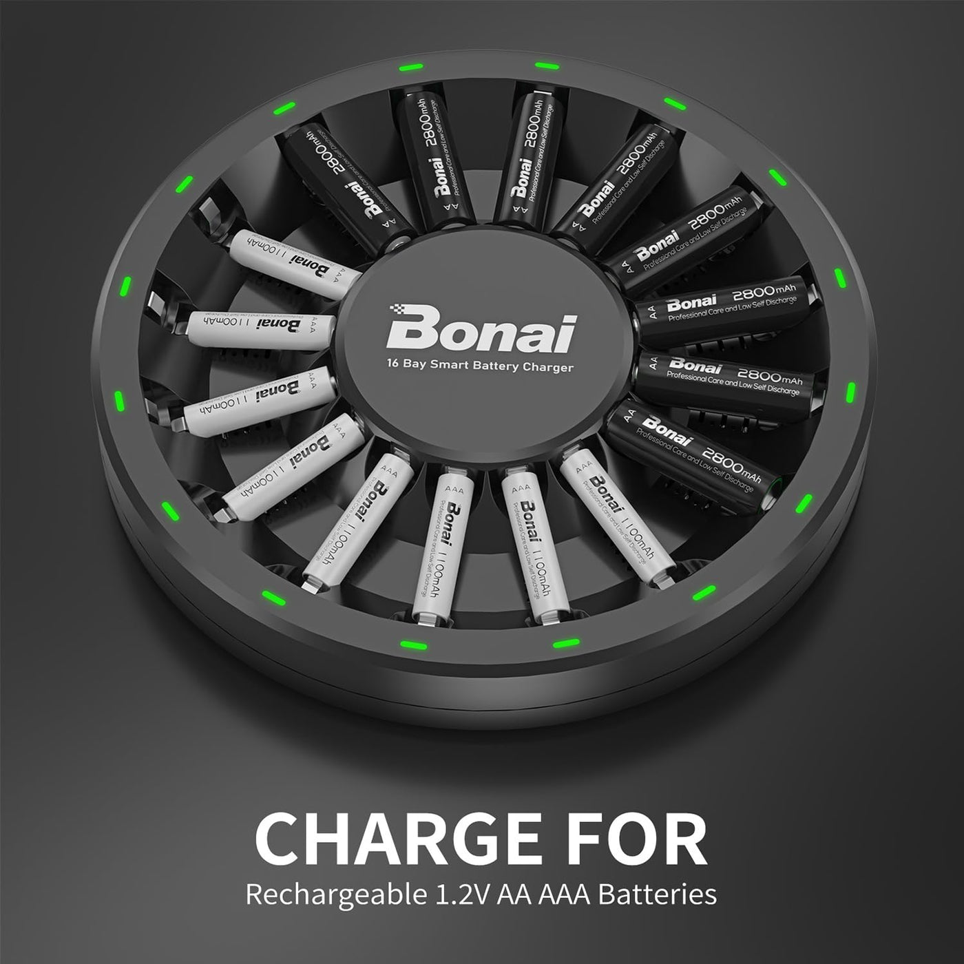 Bonai 16 Bay Aa Aaa Smart Battery Charger Round For Rechargeable Aa Aaa Nimh Nicd Batteries With Smart Led Light And Plug High Speed Charging
