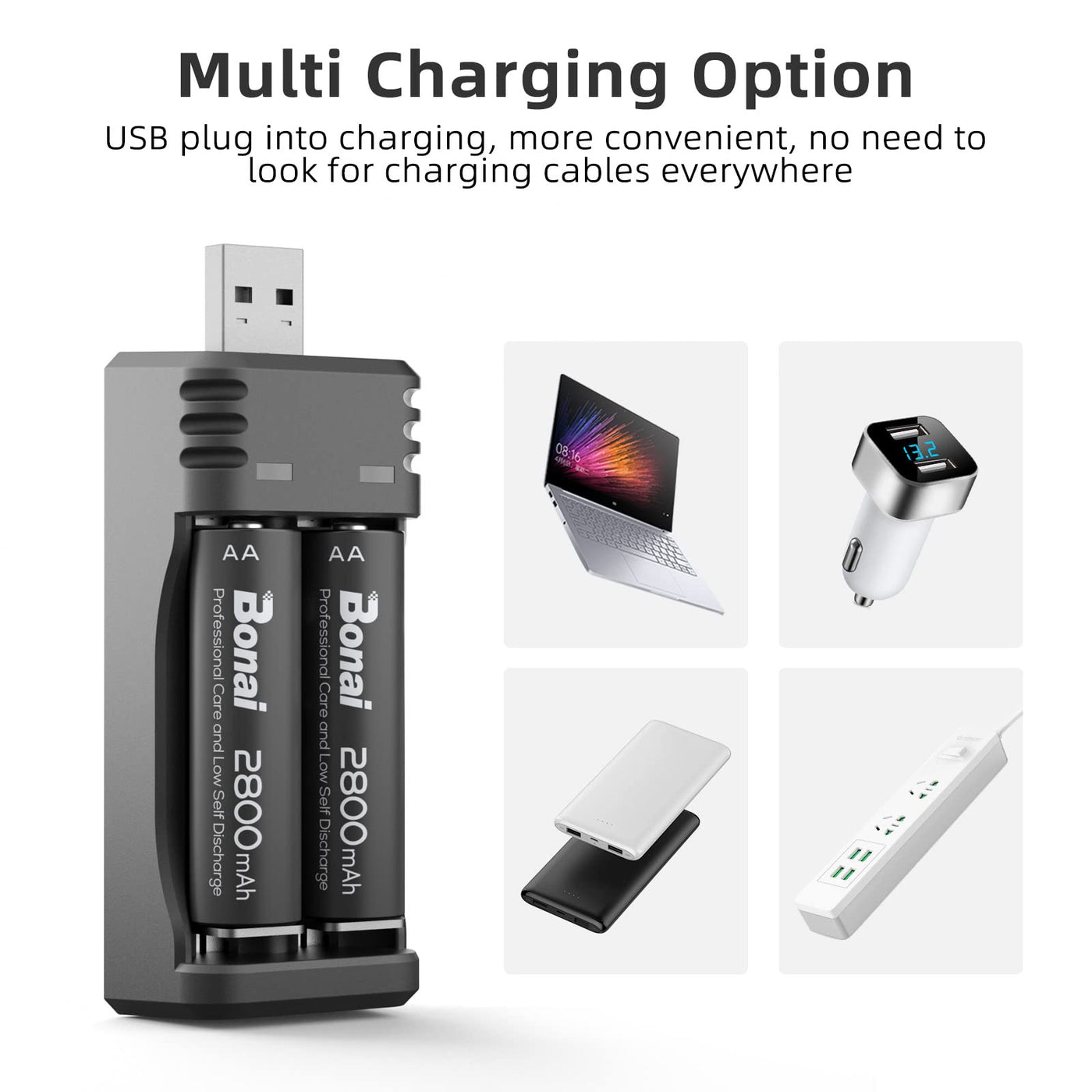 Q: How do I charge the BONAI rechargeable batteries?A: The BONAI set includes a USB charger with independent charging slots for each battery. Simply place the AA rechargeable batteries into the charger, connect it to a power source, and the intelligent control technology will manage the charging process, switching to trickle charge mode when the batteries are nearly full.