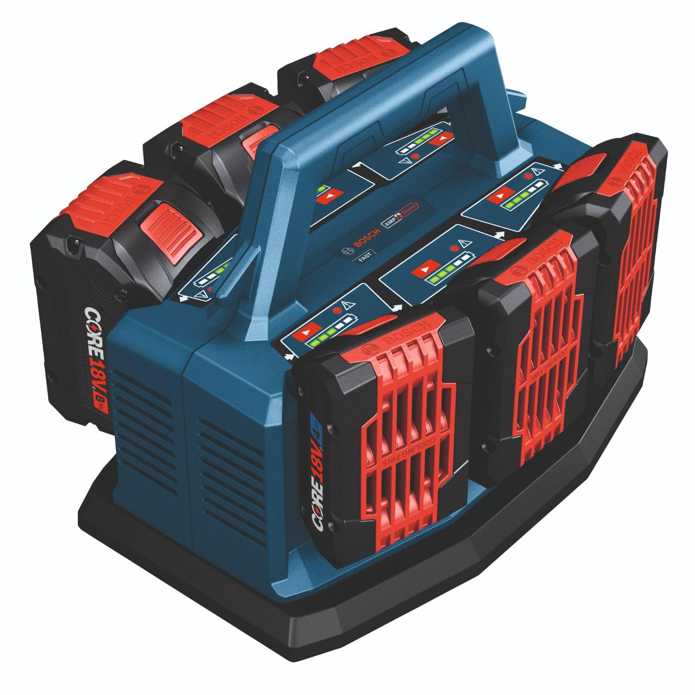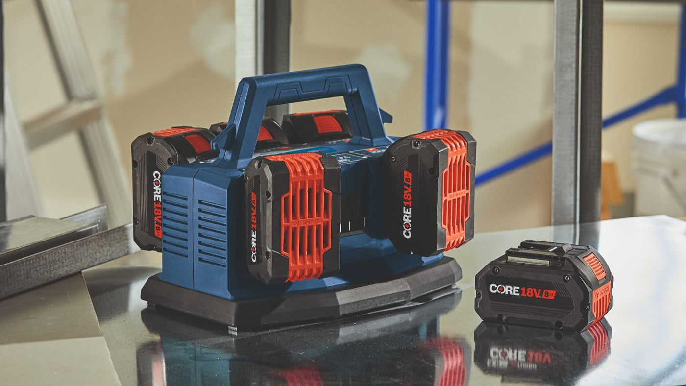 The Bosch Gal18V6-80 6-Bay Fast Charger Delivers At Least 40% Faster Charging Than Bosch Standard 18V Chargers With Core18V 8 Ah Battery. The 6-Bay Charging Design Allows Users To Sequentially Charge Six Bosch 18V Batteries. It Uses An 8-Amp Charging Current, For 4X The Charging Current Vs. The Gal18V-20 Standard Charger. This Fast-Charging Operation Charges A Spent Core18V 4 Ah Battery To 80% In 32 Minutes And To 100% In 50 Minutes. Engineered With Regulated Dual-Mode Charging, It Charges A Battery Fast While Maintaining Overall Battery Health. The First 80% Of Charge Is Fast, While The Remaining 20% In Long-Life Mode. Also, It Uses Active Air-Cooling, With A Charger-Cooling Fan That Optimizes Charging. It Has An Error Indicator To Alert The User If Charging Is Interrupted Due To Temperature And/Or Battery Failures. The Five-Led Battery-Status Indicator Provides Charging Status. It Features A Cord Wrap And Carrying Handle For Storage And Transportation Versatility. This Flexible Charging Solution Is Compatible With Bosch 18V Batteries And The Ampshare System.
