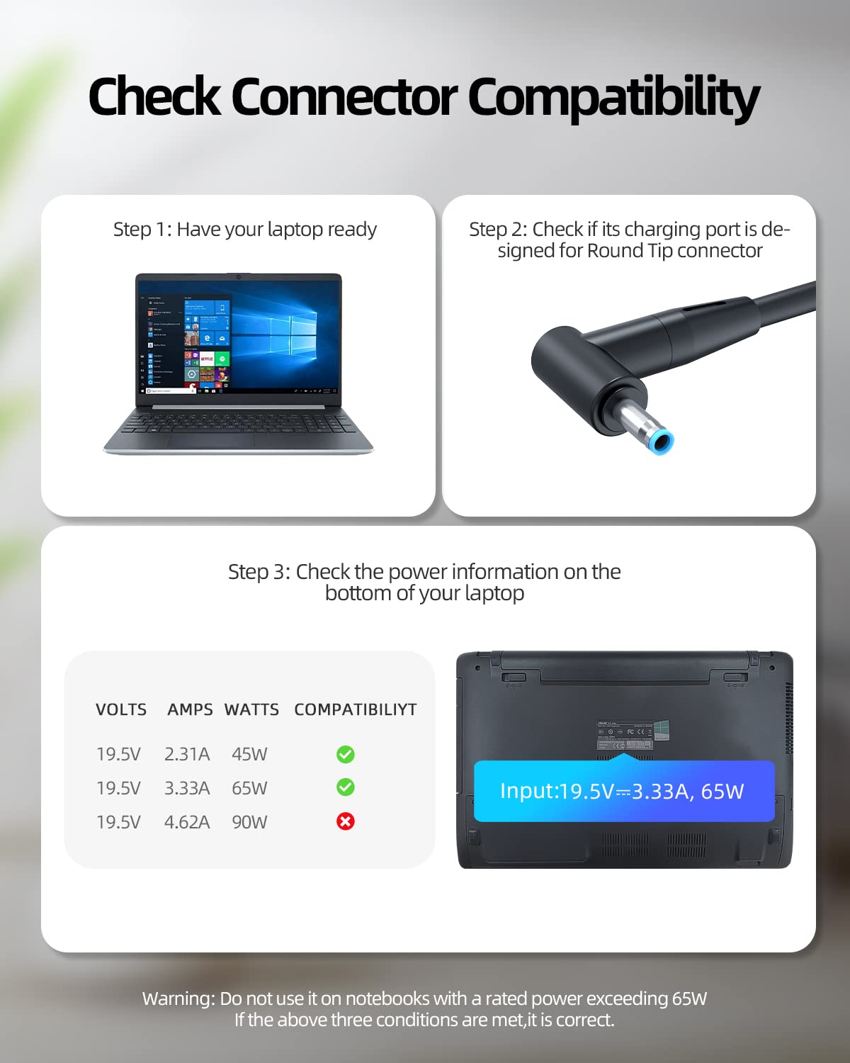 Charger Replacement For Hp Elitebook, Probook Laptop, (Safety Certified By Ul), Round Power Connector, 65W, 45W