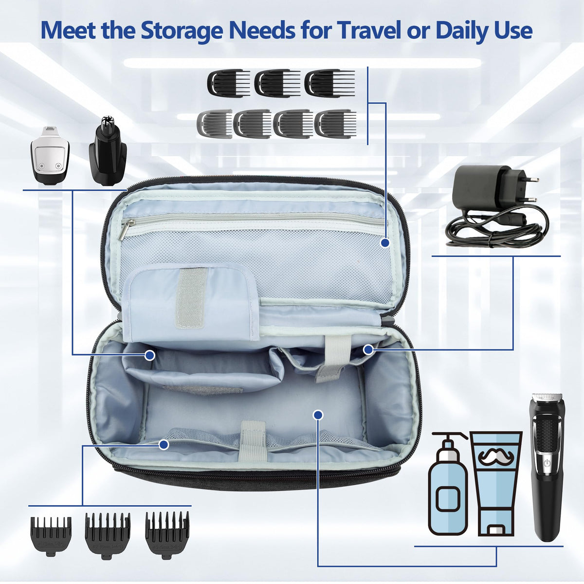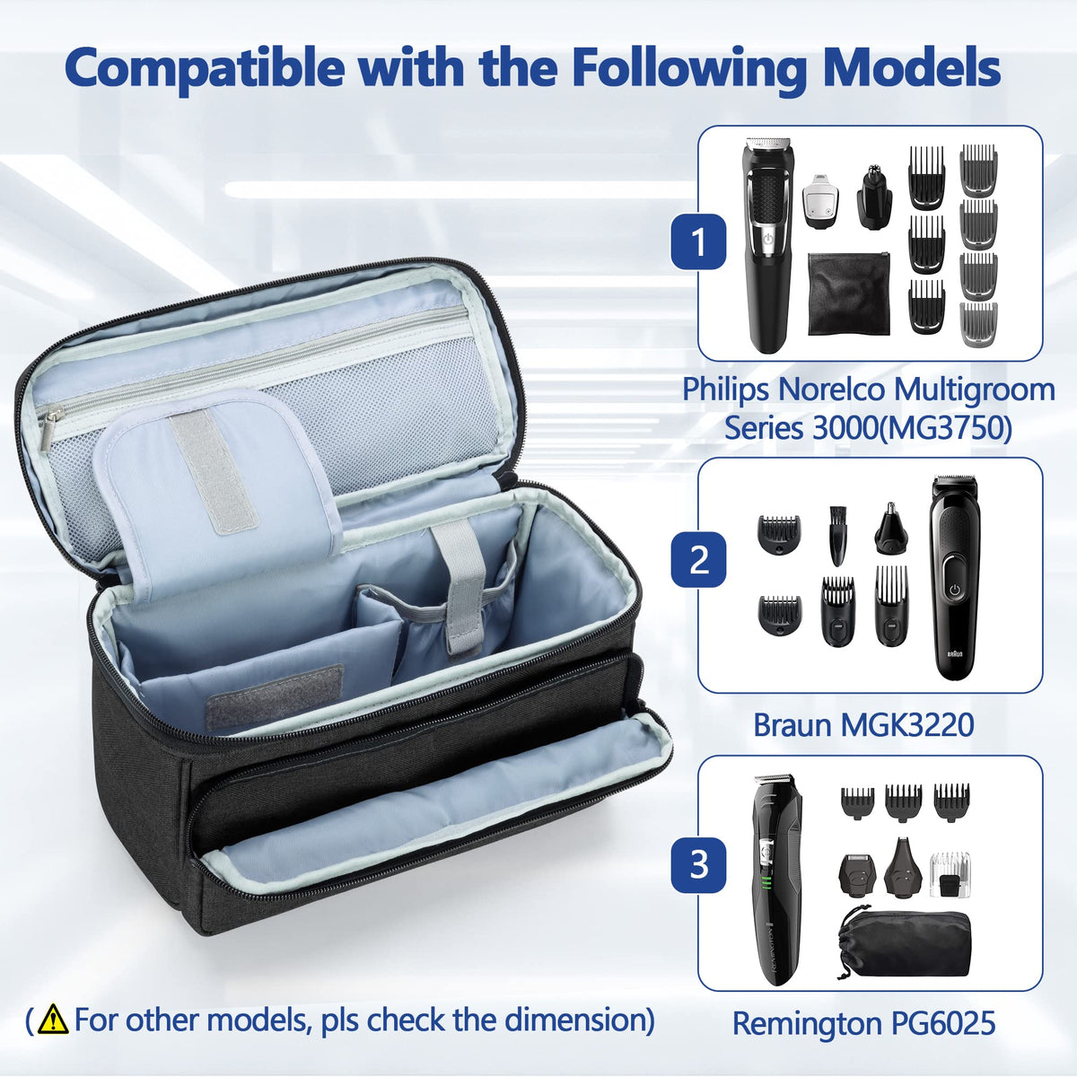 Q: What grooming tools can I fit in the CURMIO Barber Bag?A: The CURMIO Barber Bag is designed to hold hair clippers, electric shavers, and other grooming tools. It is compatible with popular models such as Philips Norelco Multigroom Series 3000, Braun MGK3220, and Remington PG6025, as well as most standard hair clippers from brands like Andis, Hatteker, Oster, and Wahl.