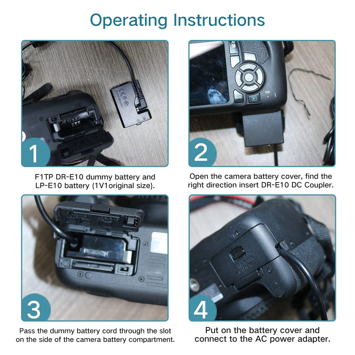 Specification: Input: 100-240Vac 50/60Hz, Output: 7.4V/2A 15W Ac Cable 4 Ft/120Cm, Dc Power Cord 5 Ft/150Cm, With Magnetic Ring, Anti- Interference. Ul Ce Etl Fcc Saa Pse Rosh Approval And Certification. Abs + Pc Materials, Pure Copper Cable Core, Power Supply Class Vi Energy Efficiency Buit-In High Quality Chip With Overcharge, Overcurrent, Overvoltage, Temperature, Shortage, Lightning Protection, To Provide The Ultimate Protection For Your Camera And Extend The Life Of The Camera Ack-E10 Ac Power Adapter Dc Coupler Dummy Battery Kit Replacement Canon Lp-E10 Battery Pack, To Solve The Trouble Of Frequent Battery Replacement, To Continuous Power For The Camera, To Meet Long-Term Shooting Of Pictures And Vlog Videos.Compatible Canon Camera Models: Canon Eos Rebel T3 T5 T6 T7 Canon Eos Kiss X50 X70 X80 X90 Canon Eos 1100D 1200D 1300D 1500D 2000D Packing List: 1 X Ack-E10 Ac To Dc Power Adapter1 X Ac Cord ( Us Plug )1 X Dr-E10 Dummy Battery (Dc Coupler)30 Days Money Back 365 Days Warranty Please Feel Free To Contact With Us For Any Questions. We Are A Professional Power Adapter Manufacturer, Our Goal Is To Fit All Electronic Devices In Your Home, Please Use F1Tp Products With Confidence, If You Have Any Product Problems, Please Feel Free To Contact Us, We Are Guaranteed To Solve Your Problems For You.
