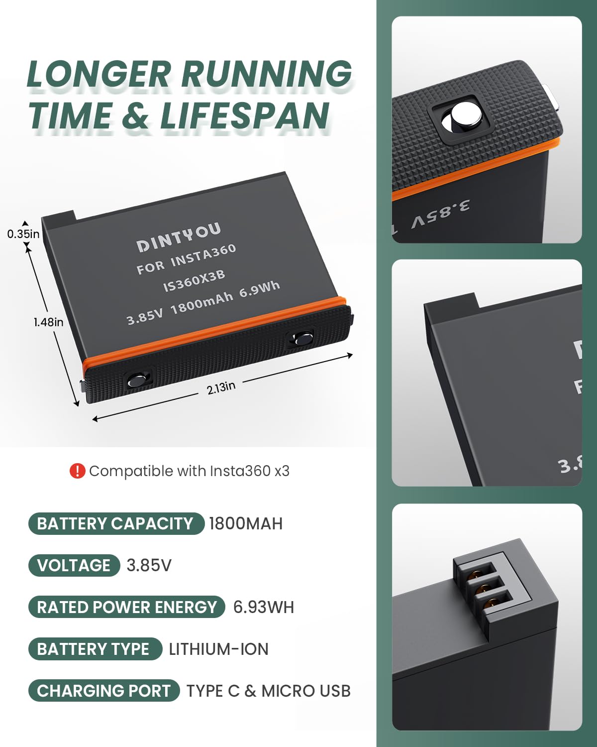 Q: What is the capacity of the replacement battery included with the charger?A: The replacement battery included has a capacity of 1800mAh, providing longer shooting times for your Insta360 X3 camera.