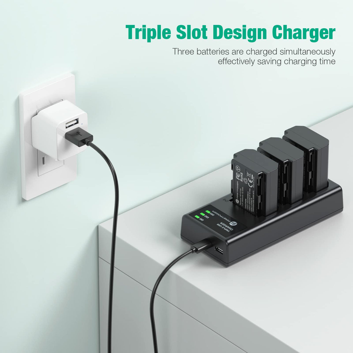 Q: How long does it take to charge the NP-FZ100 batteries using the triple slot charger?A: The FirstPower triple slot charger allows for simultaneous charging of three NP-FZ100 batteries. Charging time may vary based on the power source, but it typically takes around 4-6 hours to fully charge all three batteries when using a suitable USB wall charger.