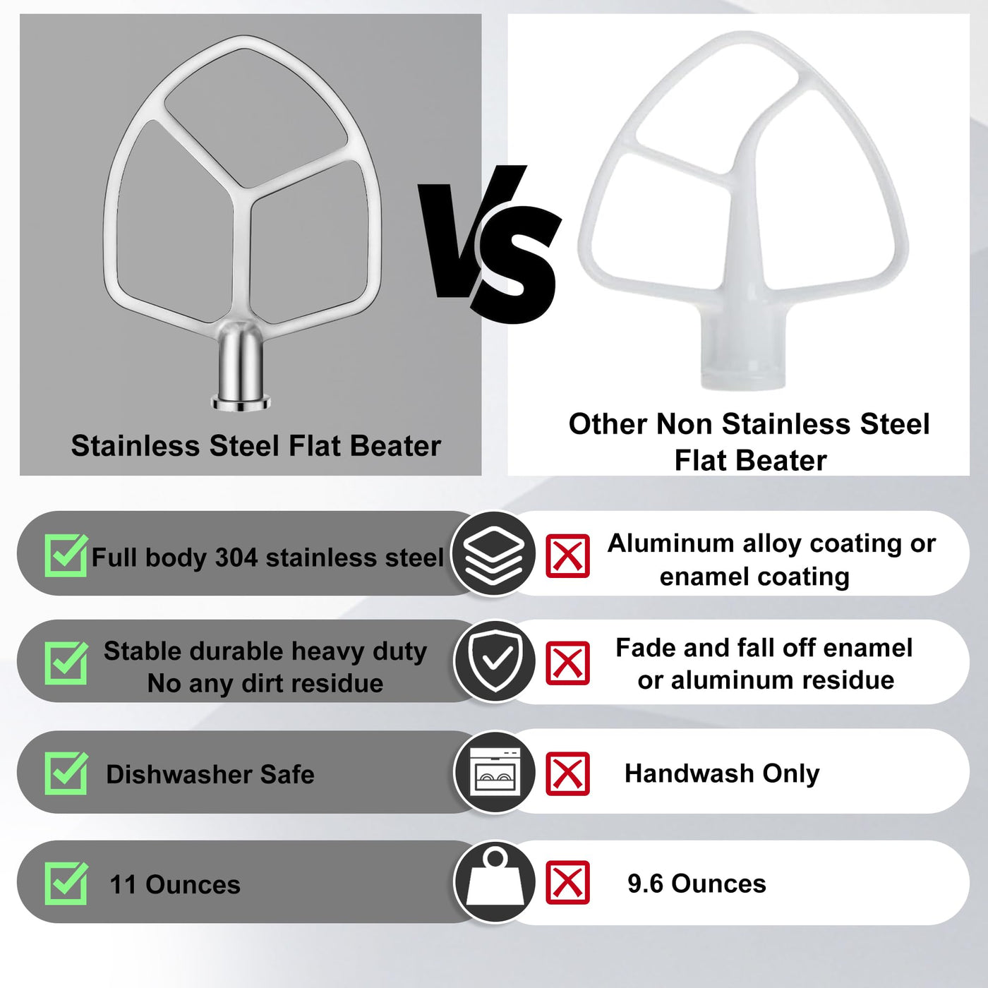 Q: What material is the Flat Beater made of?A: The Flat Beater is made of premium food-grade 304 stainless steel, ensuring durability and a healthier mixing experience without the risk of coating chipping or cracking.