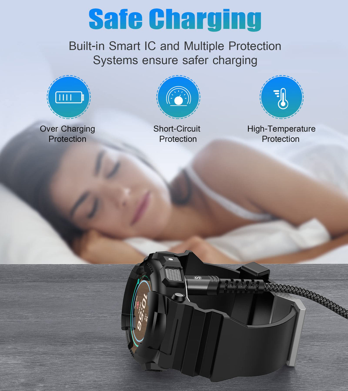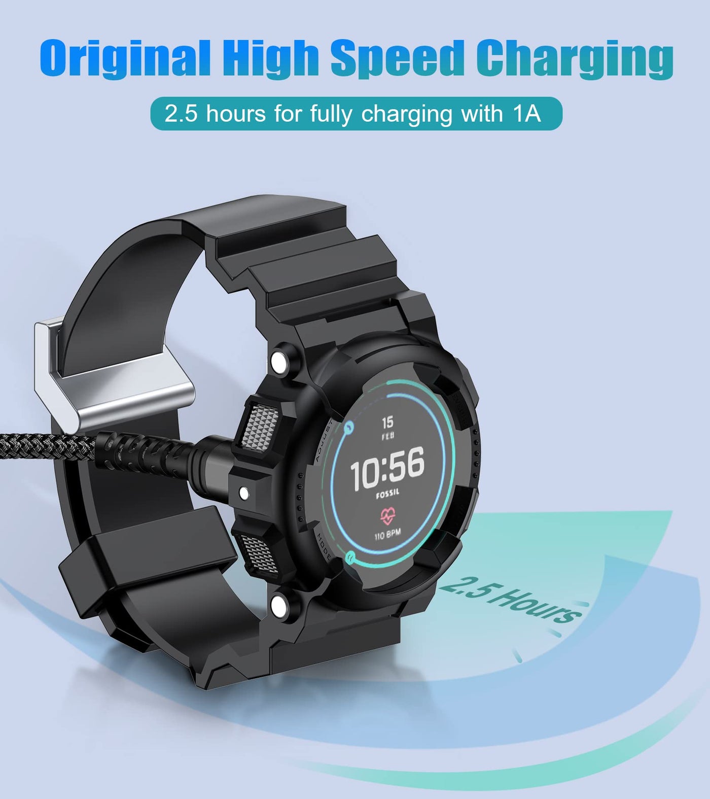 Q: How fast does this cable charge my Garmin watch?A: This charging cable supports safe high-speed charging, allowing you to fully charge your Garmin watch in approximately 2.5 hours with a standard 1A charger.