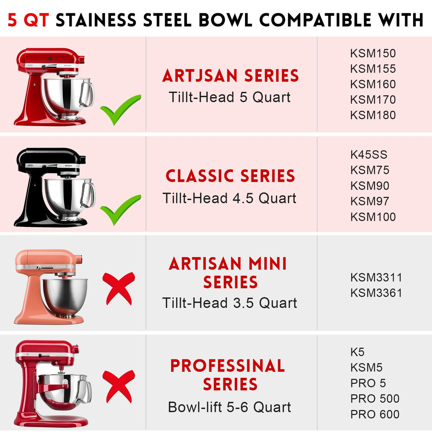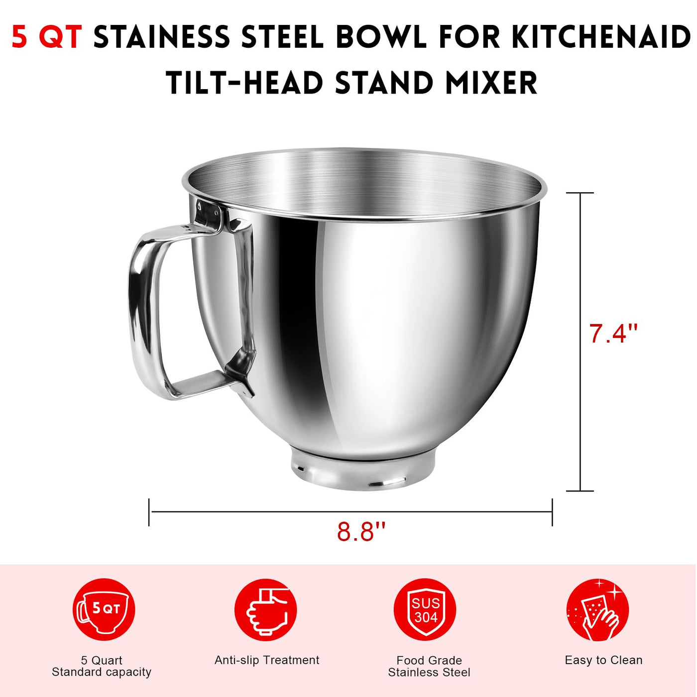 Ergonomic Handle Design: Ergonomic Handle Design: The Mixer Bowl Handle Is Designed To Conform To The Natural Shape Of The Human Grasp, And The Cylindrical Handle Is Comfortable To Hold. Large Handle Space Makes It Easier For You To Put The Mixing Bowl On Or Take Off The Mixer While Cooking, And You Don'T Have To Worry About The Mixing Bowl Tipping Overperfect Compatibility: Stainless Steel Mixer Bowl Fit For Kitchenaid All 4.5 -5 Quart Kitchenaid Tilt-Head Stand Mixers Including K45, K45Ss, Kn15E1X, Ksm75, Ksm85Ps, Ksm88Psq, Ksm90, Ksm95, Ksm96, Ksm97, Ksm100, Ksm103, Ksm105, Ksm110 ,Ksm120, Ksm150, Ksm150A, Ksm151Ps, Ksm152, Ksm153, Ksm154, Ksm155 Ksm158, Ksm160A, Ksm175,Ksm180Rpmb ,Ksm180, Ksm180Lebksuperior Materials & Perfect Capacity: The Mixer Bowl Made Of High-Quality Stainless Steel, Strong And Sturdy. 5Qt Capacity Is Perfect For Making Multiple Loaves Or Cakes At Once. Its Ample Capacity Is Perfect For Preparing Food For The Whole Family, Parties, Or Dinners With Friendsmultipurpose: The Mixing Bowl Is Perfect For Making Dough For Pizza, Cakes, Cookies And More. It Can Also Be Used To Mix Various Things Such As Flour, Potatoes, Cheese, Icing Sugar, Etckitchen Companion: 2 Mixing Bowls Allow You To Mix Potatoes Or Other Foods While Mixing The Dough. You Dont Have To Worry About Stopping To Clean, Saving You Time And Energy