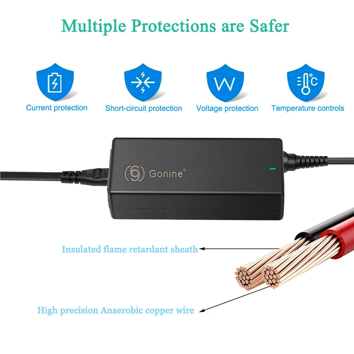 Q: Is this charger safe to use with my laptop?A: Yes, the Gonine 90W Universal Laptop Charger is designed with safety features such as over-voltage, over-current, and short-circuit protection. It is crucial to ensure that your laptop's voltage requirements match the charger's output specifications to maintain safety and efficiency.