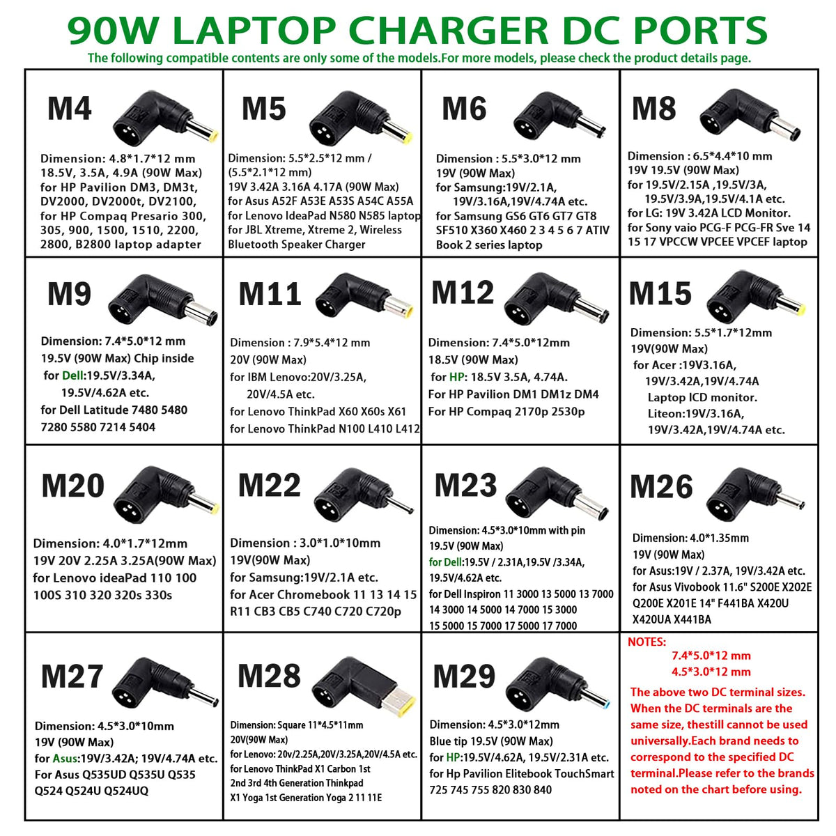 90W Universal Laptop Ac Power Adapter Kit Compatible With: For Acer Aspire: E15, E5-575G-57D4, E5-575-33Bm, A114-31-C4Hh, Cb3-131-C8Gz, 14 Cb3-431-C5Fm Cb5-571-C09S Fro Acer Chromebook:11 13 14 15 C720, R11 C740 Cb3 Cb5, For Aspire P3 S5 S7 For Vivobook F510Ua F510Ua-Ah51, K501Ux For Zenbook Ux330Ua-Ah54, Ux330Ua-Ah55, Ux21E, Ux31E Seriesfor Dell Inspiron 11Z-1121 1320 13Z-5323 14-3420 14Z-5423 15R-5520 15R-5537, 14R 17R, N5010 N7110, Studio 15 17For Hp Stream: 11 13 14, X360, 14-Ax010Nr, 14-Ax020Nr, 14-Ak040Nr, 14-Ax050Nrfor Hp Chromebook 14 11 G3 G4 G5For Hp Envy Touch Smart Sleekbook: M6, M7, 15-J, 17-J, Dv1415500060008000, Dv4 Dv6 Dv7, Dm4 G6 G7, 2000 For Sony Vaio Vgp-Ac19V39, Vgp-Ac19V47Etcfor Lenovo Thinkpad Z60, T410, Sl400, Sl510 For Toshiba Chromebook 2 Cb35 Cb30, Satellite C55-C5241, P755 P775 P870 S855 U305 U505For Samsung Np530U4Bl Gs6Gt678, X05 Series, Vm Gt Nt For Gateway Nv55C15 Connectors: M4: 48*17*12Mm 185 11A, 27A, 38A, 474A, 49A For Hpm5: 55*25*12Mm 55*21*12Mm 190V 316A, 342A, 474A For Acer,Toshiba M6: 50*30*12Mm 190V 21A, 316A, 474A For Samsungm8: 65*44*10Mm 195V 215A, 3A, 39A, 41A For Sonym9: 74*50*12Mm 195V 334A, 462A For Dellm11: 79*54*12Mm 200V 325A, 45A For Lenovo, Ibmm12: 74*50*12Mm 185V 35A, 474 For Hpm15: 55*17*12Mm 19V 316A, 342A For Acer Gatewaym20: 40*17*12Mm 19V 158A For Toshibam22: 30*10*10Mm 19V 21A For Acerm23: 45*30Mm Dell: 195V 231A 334A 462A Etcm26: 40*135Mm Asus: 19V 175A 237A 342A 474A Etcm27: 45*30*10Mm 19V 342, 474A For Asusm28: Square 11*45*11Mm 20V 225A, 325A, 45A For Lenovom29: 45*30*12Mm 195V 231A, 462A For Dell