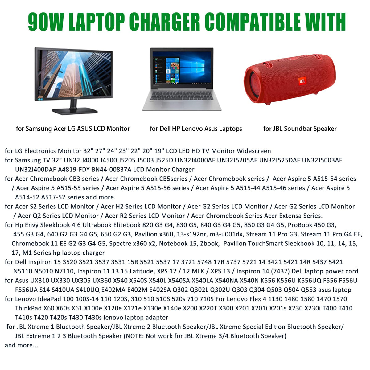 Q: What laptops are compatible with the Gonine 90W Universal Laptop Charger?A: The Gonine 90W Universal Laptop Charger is compatible with a wide range of laptops from brands such as HP, Dell, Acer, Asus, Toshiba, Lenovo, and Gateway. Specific models include Acer Aspire E15, Dell Inspiron series, HP Stream, Lenovo ThinkPad, and many more. For a complete list of compatible models, please refer to the product description.