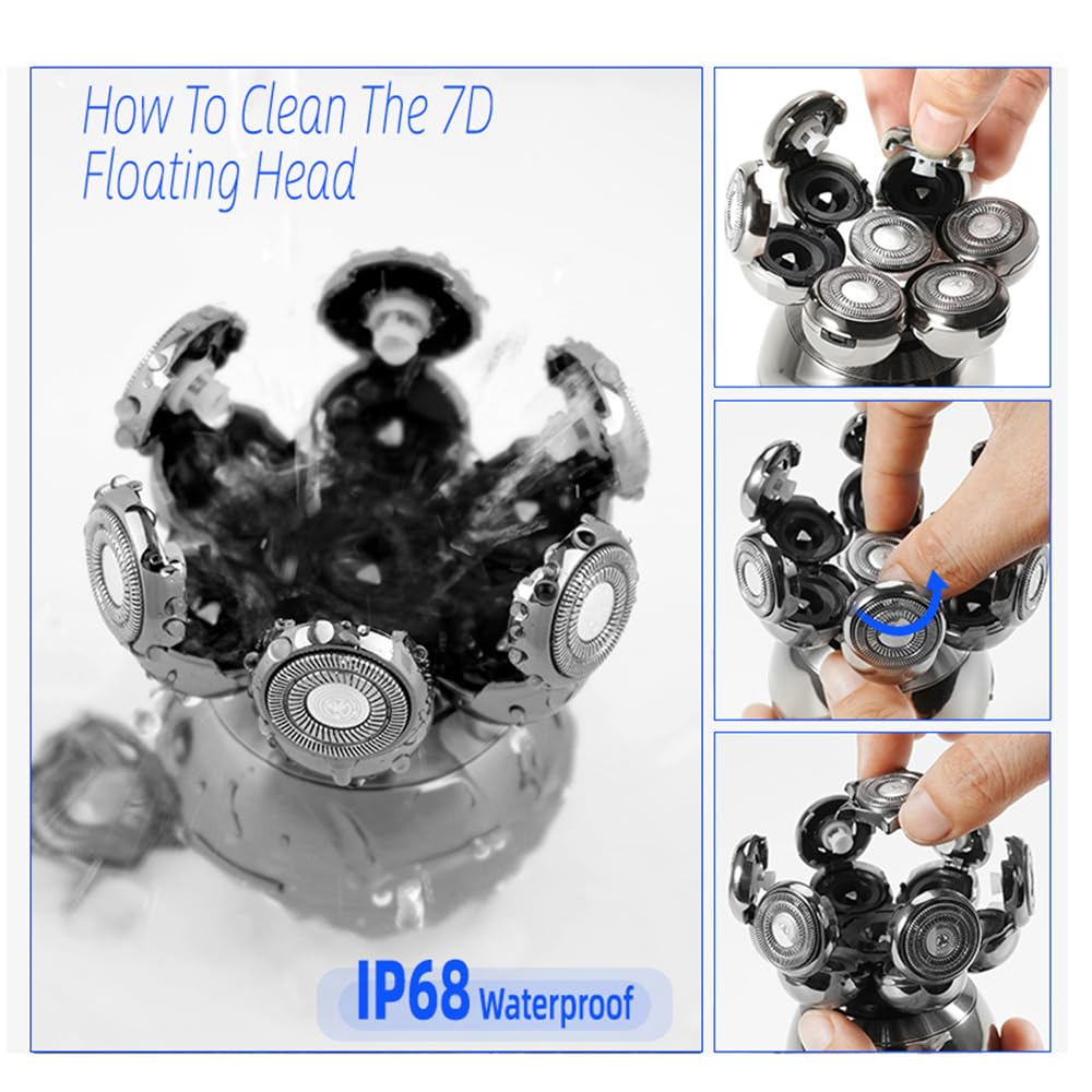 Feature: 1. Seven Independently Floating Heads, Intelligent Shaving. 2. It Can Shave Your Beard, Your Head, One Machine Dual Purpose, Economic And Practical. 3. Ip68 Waterproof, The Whole Body Is Washable And Can Be Cleaned With Running Water. 4. Comes With A Pop-Up Sideburns Trimmer, Can Be Used For Trimming Mustache And Sideburns. 5. 5 In 1 Kit, Besides The Razor Head, There Are Precision Trimmer Head, Nose And Ear Trimmer Head, Soft Face Sponge And Facial Cleaning Brush. 6. The Nose And Ear Trimmer Head: Can Be Used For Removing Your Nose And Ear Hair. 7. The Facial Cleansing Brush: With Very Fine Bristles, It Removes Oil And Dirt On The Skin, Suitable For Face Exfoliating, Cleansing. 8. The Soft Face Sponge: Pre-Shave Massage To Soften Stubble For Easier Shaving. Note: The Head Shaving Function Is Only Suitable For Those Who Often Stay Bald Head, Because The Scalp Of People Who Don'T Always Stay Bald Head Is Relatively Fragile, And Suddenly Shave May Hurt The Scalp. Package Include: 1 X Electric Shaver(With Protective Cover) 1 X Nose And Ear Trimmer Head(With Protective Cover) 1 X Facial Cleaning Brush(With Protective Cover) 1 X Soft Sponge Brush 1 X Precision Trimmer Head 4 X Limit Comb 1* Charging Seat 1 X Cleaning Brush 1 X Usb Cable 1 X User Manual (English/Chinese)