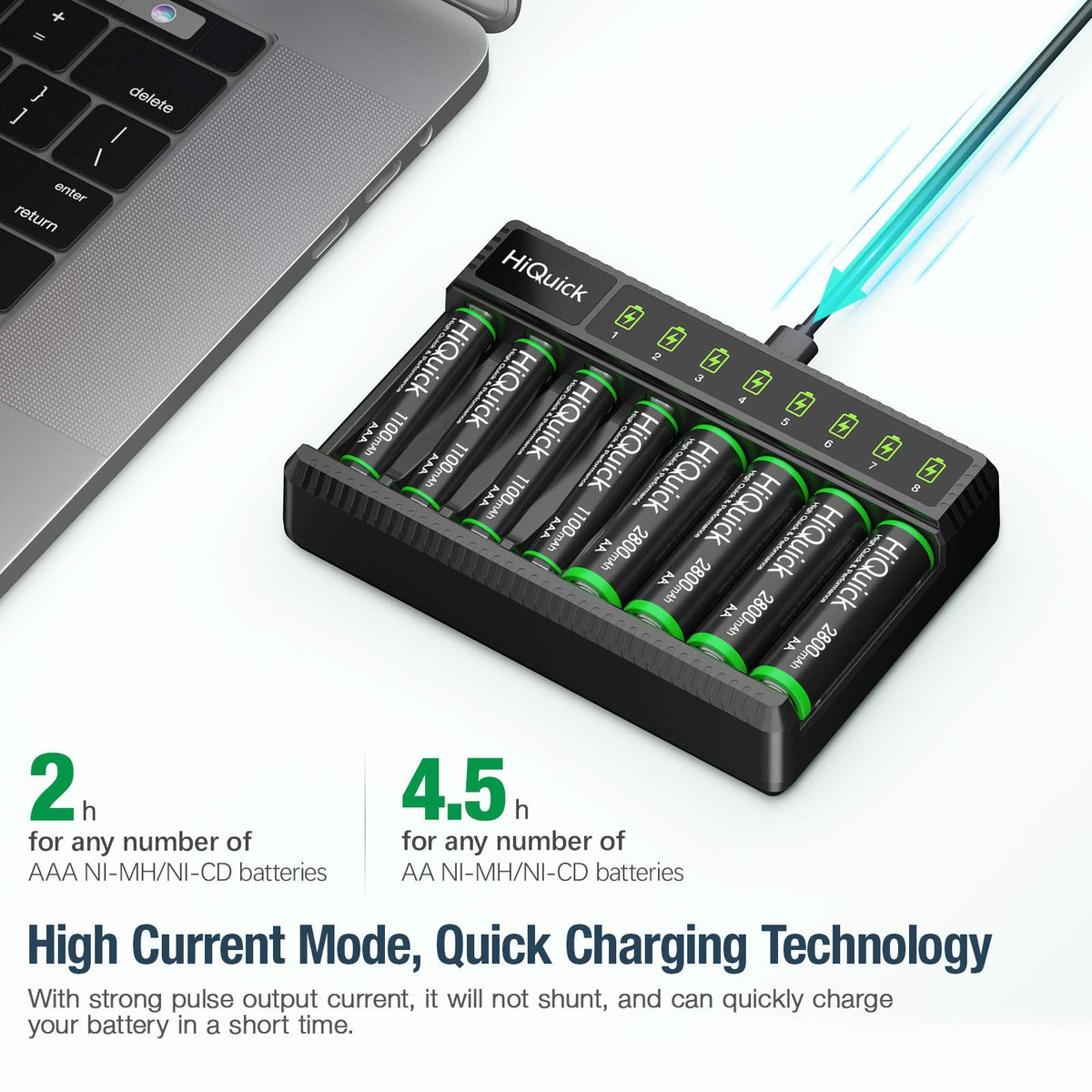 Qwho Is Hiquick A: Hiquick Is One Of The Leading Battery And Charger Manufacturing Companies That Are Engaged In Aa, Aaa, C, D, 9V, 18650 Batteries And Related Battery Chargers, It Has More Than 20 Years Of Battery R D And Production History Qhow About Hiquick A: Hiquick Rechargeable Batteries And Battery Charger Are Sold In Many Countries And Are Widely Recognized For The High Quality Specifications Input: Micro Usb Dc5V2A Output: 12Vdc 600Ma A10 Battery Charging Rate: 85 Charging Way: Constant Voltage And Current Control Size Weight Size: 125Mm85Mm28Mm Weight: 98G (No Batteries Included) Environment Conditions Using Environment: Temperature: 0-35 Humidity:35-95 Storage Environment: Temperature: 0-40 Humidity: 45-85 Superior Charger Comes With Micro Usb Port, Lightweight And Portable Design You Can Easily Put This Portable Charger Into Your Pockets, Handbags, Backpacks Or Suitcases, Much Convenient For Travel Multiple Protection With Overheat-Detection To Prevent Over-Charging, Short Circuit Protection And Reverse Polarity Protectionit Can Charge Your Battery Efficiently All In One Independent Slot Charging Technology Let You Charge Your Aa Aaa Ni-Mh Ni-Cd Batteries In One Charger Charging Time Table 1 To 8 Aaa Batteries 2 Hours 1 To 8 Aa Batteries 45 Hours Package Micro Usb Cable X 1 User Manual X 1 8 Bay Battery Charger X 1 Aa Rechargeable Battery4 Aaa Rechargeable Battery4