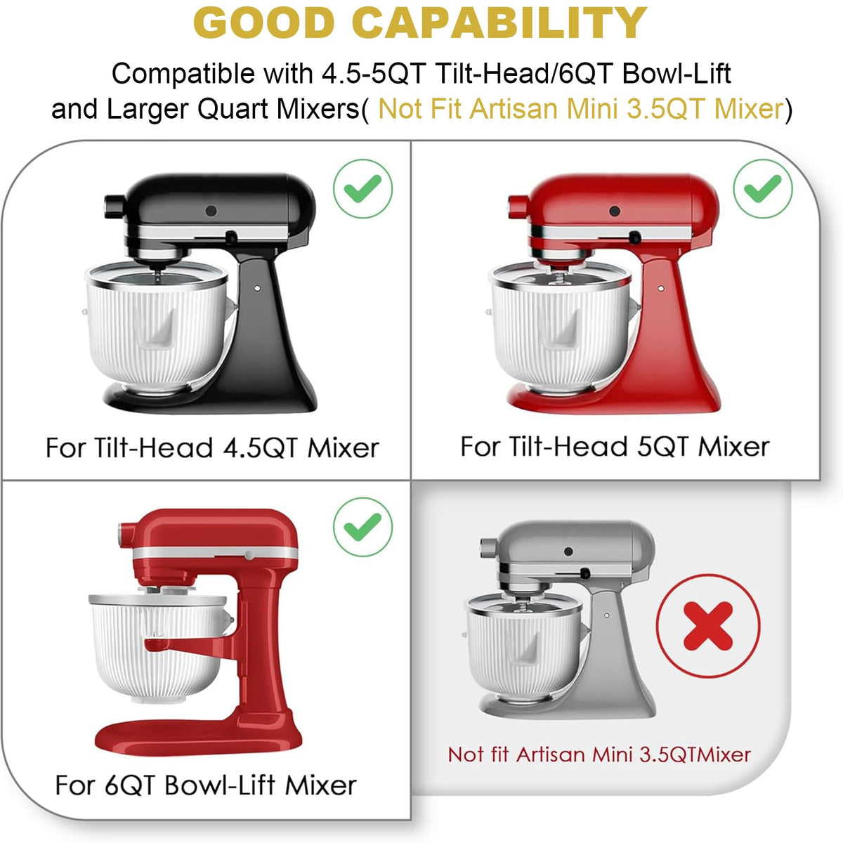 Q: What KitchenAid mixers are compatible with the KOYOEY Ice Cream Attachment?A: The KOYOEY Ice Cream Attachment is designed to fit all KitchenAid Tilt-Head Stand Mixers (4.5QT and 5QT models) and 6QT Bowl-Lift Stand Mixers. It is not compatible with the Artisan Mini models (KSM3316 and KSM3317) or the following 5, 5.5, and 6 Quart Bowl-Lift models: K5SS, KSM50, KSM500, and KSM450.