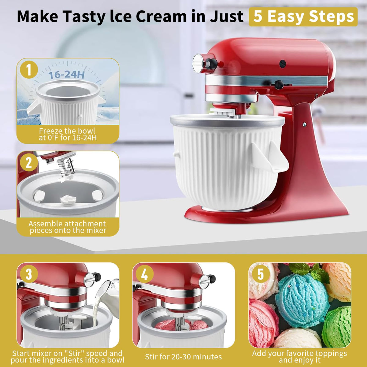 With This Koyoey Kitchenaid Ice Cream Maker Attachment, Whipping Up Ice Cream, Sorbet, Or Gelato Is A Breeze. Just Attach The Bowl To Your Mixer And Create Up To 2 Quarts Of Your Favorite Frozen Treats Right In Your Kitchen. *Stand Mixer Sold Separately Make Rich And Creamy Ice Cream At Home, Whip Up Small Batches And Enjoy Them Fresh, Straight From The Bowl. Fits All Kitchenaid Tilt-Head Stand Mixers, Except Artisan Mini Models - Ksm3316 And Ksm3317. Fits All Kitchenaid Bowl-Lift Stand Mixers, Except The Following 5, 5.5 And 6 Quart Models - K5Ss, Ksm50, Ksm500 And Ksm450. Part Includes: 1 Freeze Bowl (Hand Wash); 1 Dasher (Dishwasher Safety); 1Drive Assembly (Dishwasher Safety); 1 User Manual How To Create The Ice Cream With Our Ice Cream Maker Bowl?1.Store The Freeze Bowl In Freezer For A Minimum Of 15 Hours. Make Sure Your Freezer Is Set One The Coldest Setting.2.Prepare Your Favorite Ice Cream Batter And Chill Thoroughly.3.Assemble Attachment Pieces Onto The Mixer As Shown In Use And Care Guide.4.Important: Start Mixer On Stir Speed.5.Pour Ice Cream Batter Into The Freeze Bowl And Mix To Desired Consistency (20-30 Minutes)6.Remove Ice Cream With Non-Metalutensil And Store In Shallow Plastic Container For 4-6 Hours. &Nbsp;Note:1.Pouring Batter Into The Freeze Bowl Before Starting The Mixer May Cause The Batter To Freeze Prematurely And Lock The Dasher.2. Your Freezer Should Be Set To -0.4F To Ensure Proper Freezing Of All Foods.