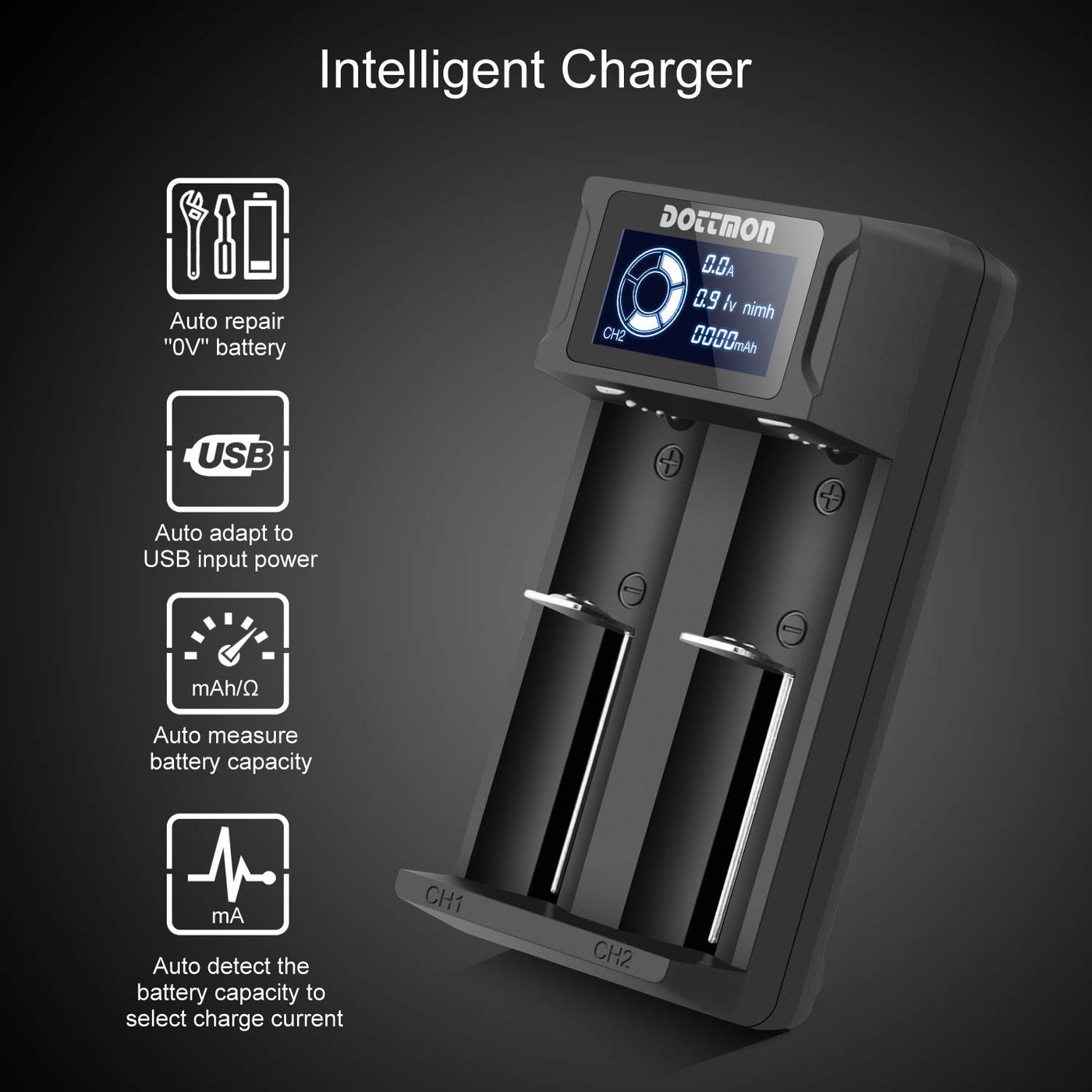 Intelligent Dottmon Lcd Display Universal Battery Charger For Rechargeable Batteries Li Ion 18650 18490 18350 17670 17500 16340(Rcr123) 14500 26650 21700, Ni Mh/Ni Cd A Aa Aaa Sc C D Batteries
