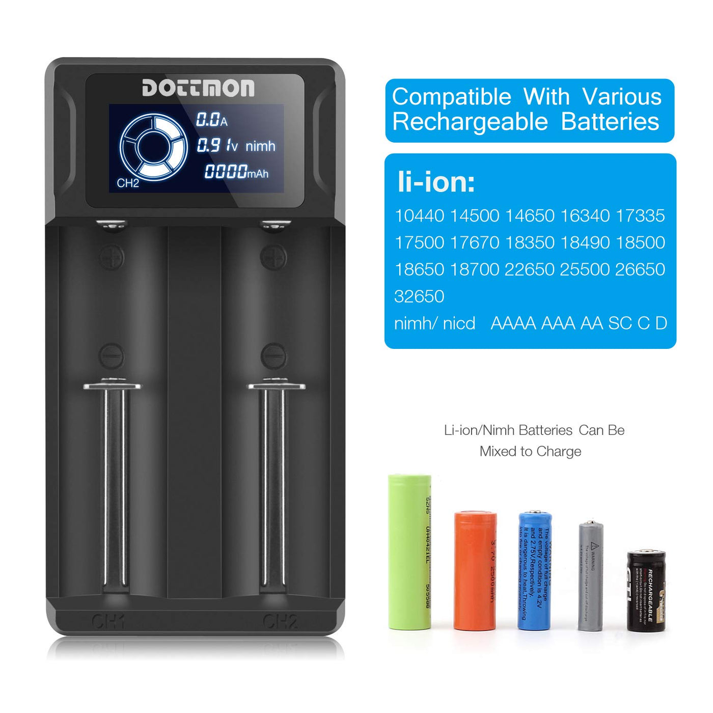Q: What types of batteries can the Intelligent Dottmon LCD Display Universal Battery Charger charge?A: The Intelligent Dottmon charger is compatible with a wide range of rechargeable batteries, including Li-ion batteries such as 18650, 18490, 18350, 21700, and Ni-MH/Ni-Cd batteries like AAA, AA, SC, C, and D.