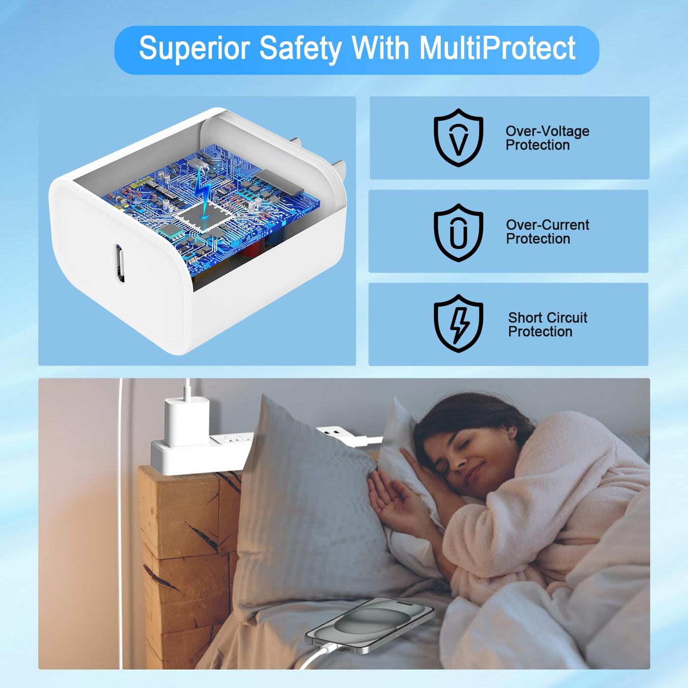 Q: Is this charger safe for my devices?A: Yes, the charger features built-in advanced USB Power Delivery 3.0 technology that protects your devices from over-current, over-voltage, over-heating, and short-circuiting, ensuring safe charging.