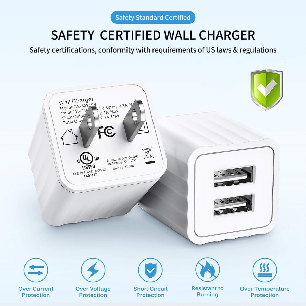 6Ft Extral Long Dual Port Apple Iphone Charger6Ft Apple Chargers For Iphone With 2 Usb Port Enables You To Charge Two Devices Like Iphone 14 Charger And Iphone 13 Charger At The Same Timemeanwhile,It Is The Perfect Length So You Can Be Free To Move Around In Bed Iphone Chargers Apple Approvedthe Iphone Fast Charger With Lightning Cable Cord Is Compatible With Apple Iphone 14Apple Iphone 14 Plusapple Iphone 14 Proapple Iphone 14 Pro Maxapple Iphone 13Apple Iphone 13 Miniapple Iphone 13 Proapple Iphone 13 Pro Maxapple Iphone 12Apple Iphone 12 Miniapple Iphone 12 Proapple Iphone 12 Pro Maxapple Iphone Se 2020Apple Iphone Se 2022Apple Iphone 11Apple Iphone 11 Pro11 Pro Maxxsxs Maxxrx88Plus77Plus66 Plus, Ipad And Ipod Ast Charging & Data Syncthe Iphone Charger Double Adapter Supports Safe And Fast Data Transfer Up To 480Mbpsshorten Charging Time And Improve High Work Efficiency To Make Your Life More Convenientwith An Output Of 21A5V, This Usb Travel Charger Provides Amazing Lighting Fast Charge In A Much Shorter Time You Can Go From Less Than 20% To Over 40% Within 30 Minutes And It Supports Safe And Fast Data Transfer Up To 480Mbps High Working Efficiency Without Getting Warm Apple Mfi Certified & Ul Safety Standardbuilt-In Apple Mfi Certified Chipset,Iphone Lightning Charger Ensures A Faster Charging Time And Automatically Stops Charging When The Apple Device Full Charge To Keep Completely Safe For You And Your Device Certified By Ul Built-In Smart Chip Recognition Functions Plus Intelligent Temperature Control System Provides Temperature Control,Short-Circuit Prevention, Preventing Your Phone From Over Chargerd And Overheating Riendly Customer Service & Warranty2 Pack] Usb Fast Wall Charger + 2 Pack] Extra Long 6 Feet Apple Mfi Certified Lightning Cable + Professional Customer Serviceplease Feel Free To Contact Us Or Raise A Qa If There Is Anything We Can Help