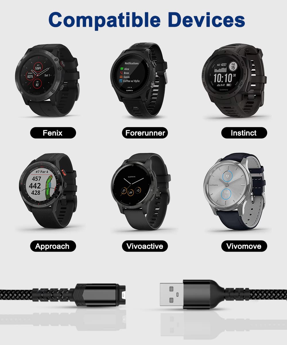 What'S In The Package Charger Cable For Garmin Watch * 2 What You Should Know * Charge Your Device By Plugging The Cable Into An Available Usb Port On A Personal Computer Or A Usb Wall Charger. * Timely Disconnection Of Your Device From The Charger Is Advised Once The Battery Is Restored To 100%. * Fully Charge A Depleted Battery Takes Up To 2~2.5 Hours. Key Features: Double-Braided Exterior And Sleek Aluminum-Alloy Finish. Long Enough To Cover Nearly All Your Charging Needs. Compatible Devices: * Fenix 5 5S 5X, 6 6S 6X Plus Pro, 7 7S 7X * Forerunner 245 Music, 45 45S 55 165 745 935 945 * Approach S10 S40 S60 S70, G12 S12 S42 S62 * Instinct 2 2S, Venu 2 2S, V�vomove 3 3S * And More Supreme Durability Ultra-Durable Design With Sleek Aluminum Shell And High-Quality Nylon Braided Jacket To Withstand Daily Twists And Pulls. Plug And Charge With The Help Of The Usb Cable, You Can Easily Hook Up Your Watch To Devices With Usb-A Ports, Pcs, Laptops, Wall Chargers, Etc. Meet Different Needs Being Longer Than Original Cable Makes It Perfect For Diffient Charging Scenarios. Pick The Right Length To Cover Your Charging Needs.