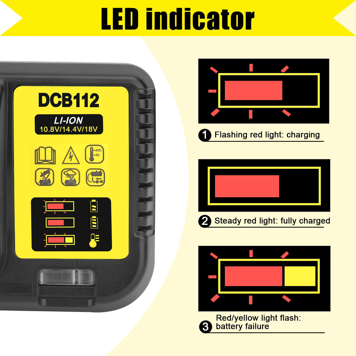 Q: How does the LED indicator work on the DCB112 Charger?A: The LED indicator on the DCB112 Charger provides real-time charging status: a flashing red light indicates that the battery is charging, a steady red light shows that the battery is fully charged, and flashing red and yellow lights signal a battery failure.