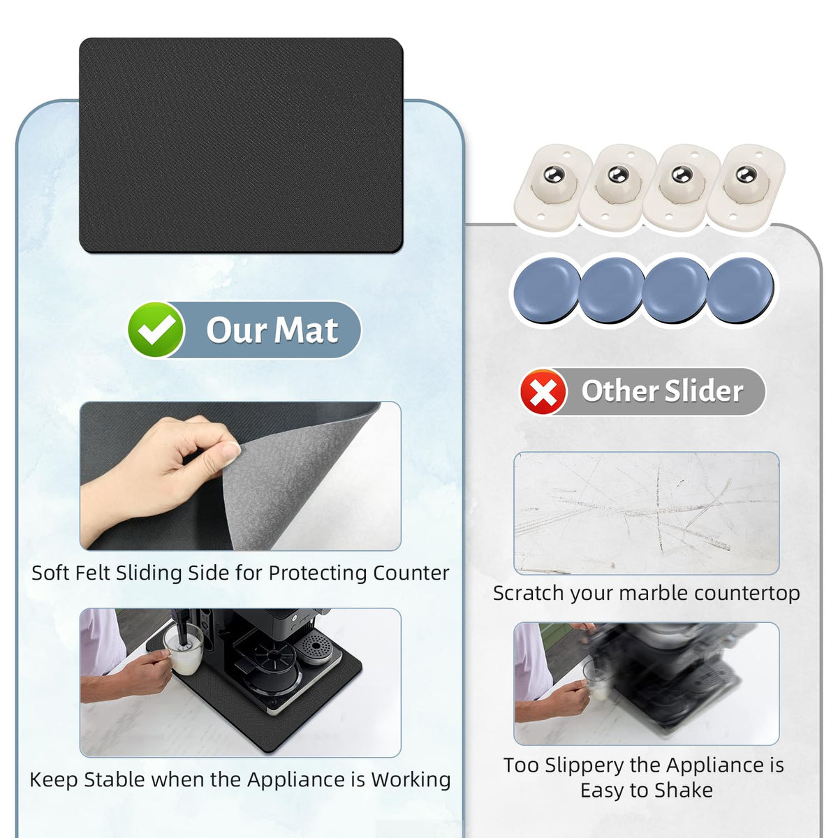 Q: Is the LOPNUR Small Appliance Slider suitable for all kitchen countertops?A: Yes, the LOPNUR Small Appliance Slider is designed to protect countertops. It prevents scratches and scuffs from dragging appliances.