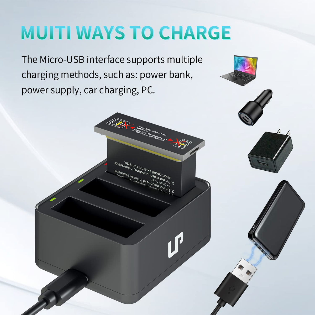 Q: Can I charge the batteries using any Micro-USB device?A: Yes, you can charge the batteries using any Micro-USB devices such as a laptop, car charger, wall charger, or power bank. However, please note that the Micro-USB charging device is not included in the package.