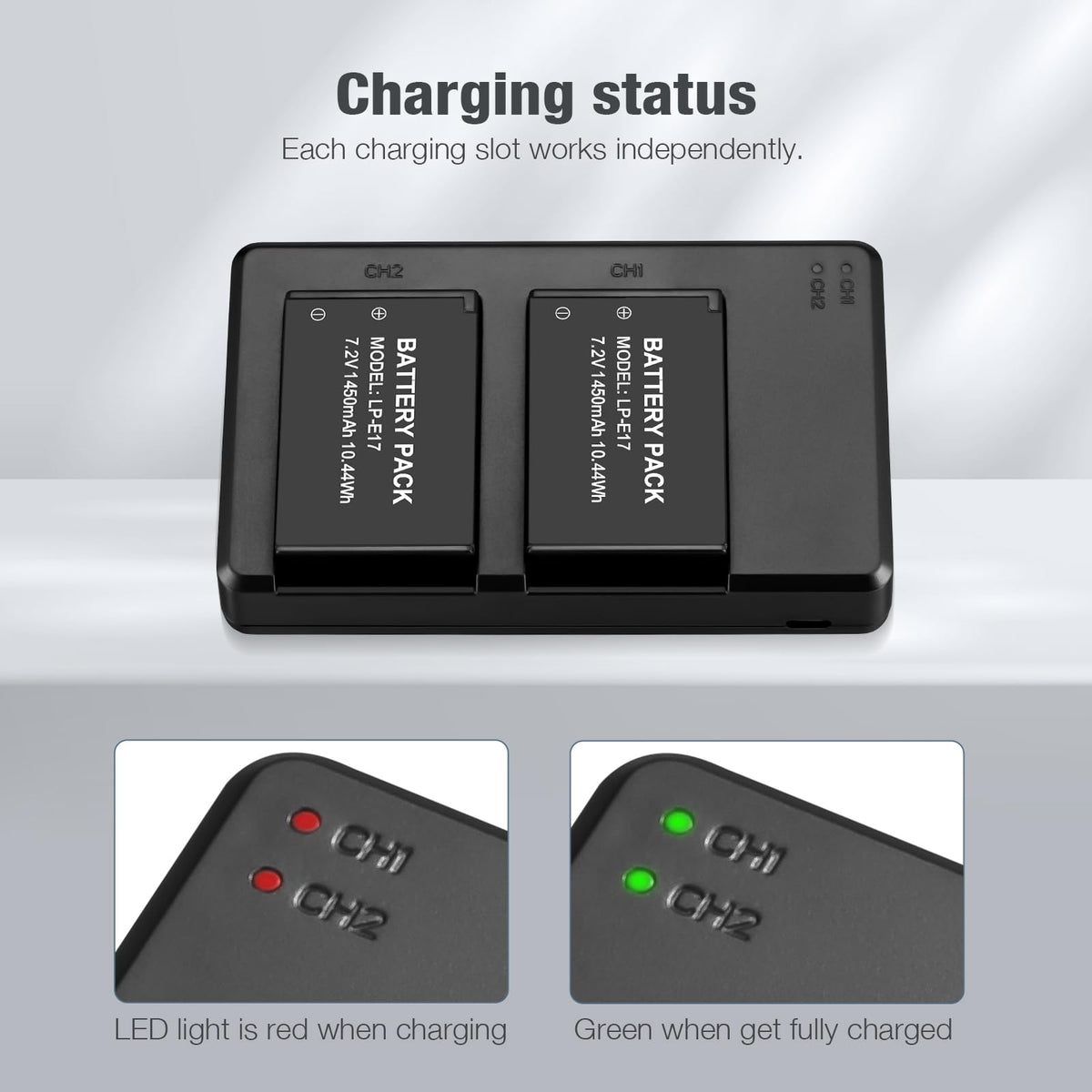 Q: How long does it take to charge the LP-E17 batteries?A: The LP-E17 batteries can be fully charged in approximately 2 hours when using the dual USB charger. Each charging slot operates independently, allowing you to charge two batteries simultaneously.