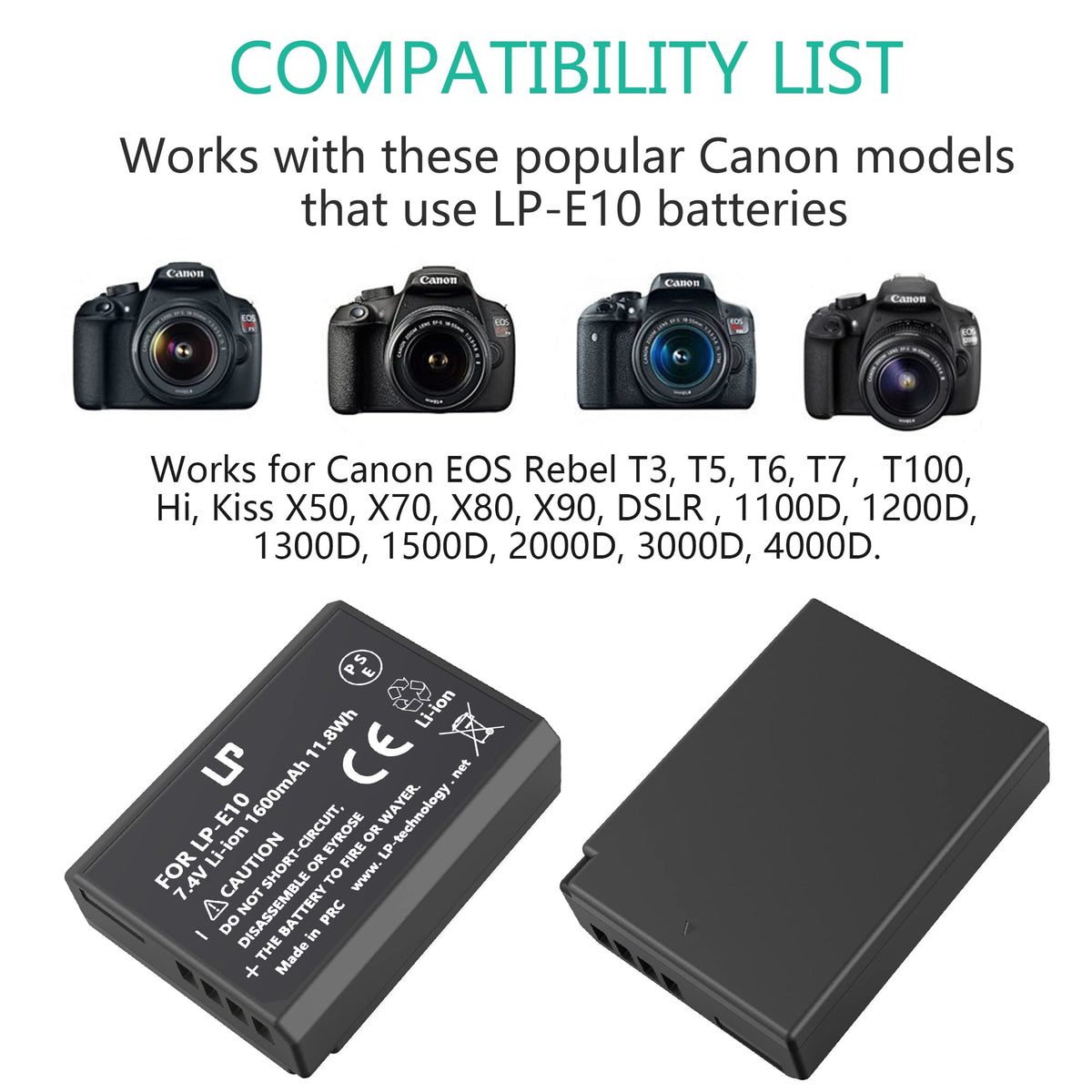 Features100% Oem Compatible: Meet Or Exceed The Oem Canon Lp-E10 Battery And Lc-E10 Charger.Safety And Reliable:Protection For Overcharge, Short Circuit, Electronic Shock With Ce, Fcc, Rohs Certifications. Lp Battery And Charger Are Tested By Manufacturer To Match Oem Products.Long Cycle Life:Generally Can Be Charged And Discharged 300-500 Times And Has Excellent Sustained Lifespan.Li-Ion Batteries Have No Memory Effect With 100% Free Storage.Smart Led Indicator:Shows The Status Of Battery. Green For Standby, Red For Charging.Portable: A Good Choice For Travel Or Other Indoor/Outdoor Activities As A Backup Battery Charger Set.Compatible With: Canon Eos Rebel T3Canon Eos Rebel T5Canon Eos Rebel T6Canon Eos Rebel T7Canon Eos Rebel T100Canon Eos 1100Dcanon Eos 1200Dcanon Eos 1300Dcanon Eos 1500Dcanon Eos 2000Dcanon Eos 3000Dcanon Eos 4000Dcanon Eos Kiss X50Canon Eos Kiss X70Canon Eos Kiss X80Canon Eos Kiss X90 Notes:?Lp-E10 Battery Is Not Compatible With Eos Rebel T3I, T5I, T6I, T7I. Eos Rebel T3 ? T3I. The Same As Others. ?If You Are Not Sure About Battery Or Battery Charger Compatibility, Please Contact Us For More Information Package Contents: 2 * Lp Lp-E10 Battery 1 * Lp Lp-E10 Battery Charger 1 * Car Charger 1 * Plug Adapter