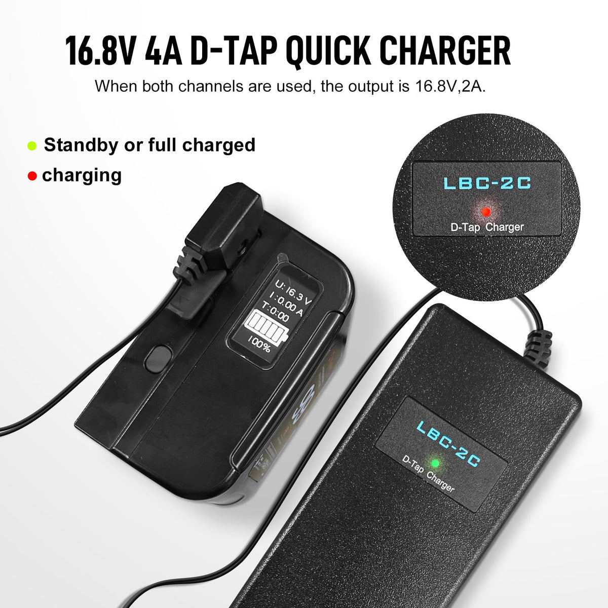 Q: What is the output voltage and current of the charger?A: The charger provides a D-Tap output of 16.8V and can deliver up to 4A on a single channel or 2A when charging two channels simultaneously, making it suitable for quick charging.