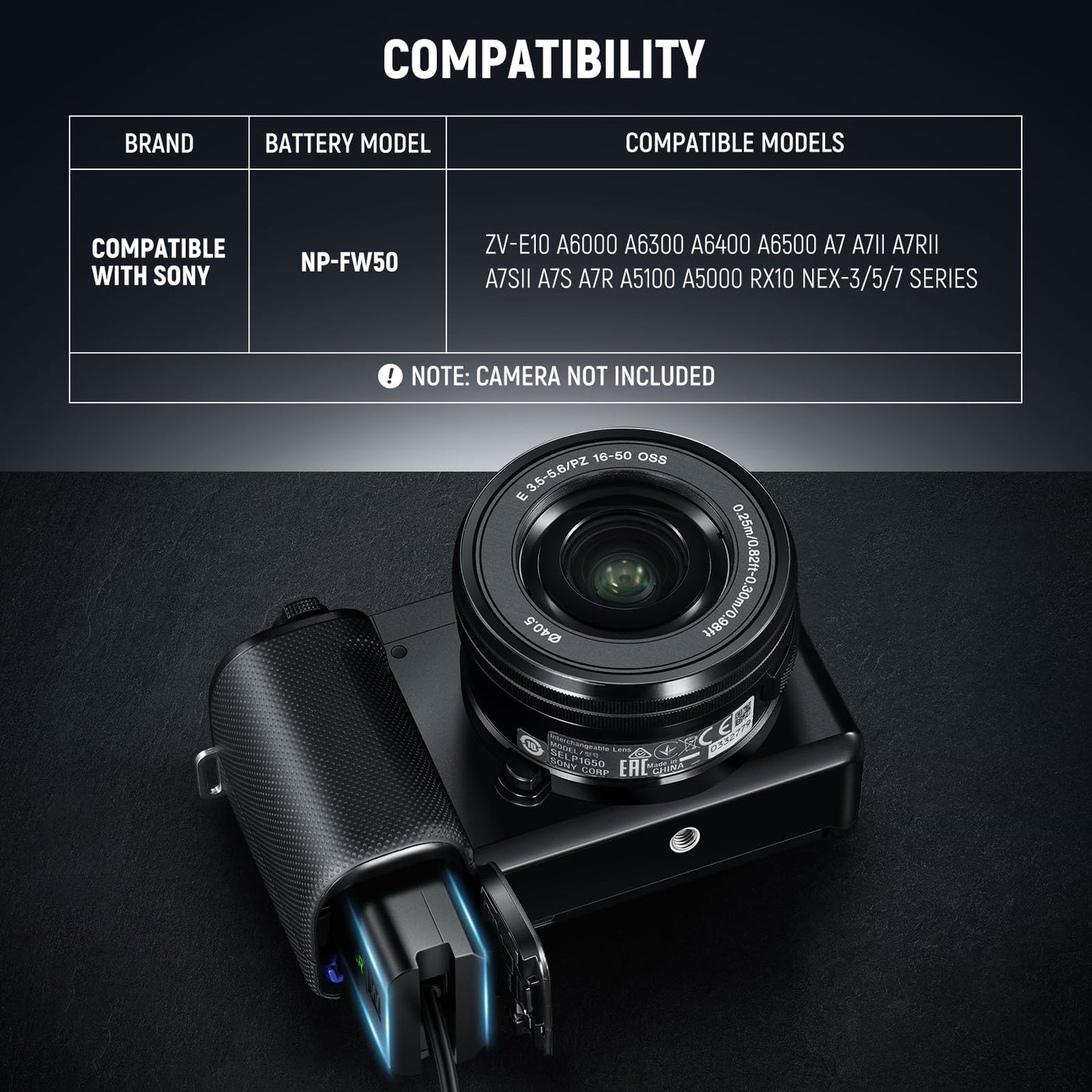 Compatible With Sony Zv-E10 A3000 A5000 A5100 A6000 A6100 A6300 A6400 A6500 A7 A7 Ii A7R A7R Ii A7S A7S Ii Nex-3 Nex-3N Nex-5 Nex-5N Nex-5R Nex-5T Nex-6 Nex-7 Nex-C3 Nex-F3 Cameras That Accept Np-Fw50 Batteries. Works With All Neewer V Mount Batteries, Including Ps099E, Bp-95W, Bp-150Ws, Bp-190Ws, Bp-V47, And V Mounts Of Other Brands. More Battery Power And A Longer Continuous Runtime For Photography, Live Streaming, Video Conferencing, Vlogging, And Filmmaking. The Protection System Prevents Overcharging, Short Circuits, Overheating, Overcurrent, Overvoltage, And Other Possible Damages. Fully Decoded, No Warning Pop Ups. Specifications Model: Vp-Fw50 Dimensions:2'' 1.3'' 0.7''/50 34 18Mm Weight: 2.1Oz/60G Wire Length: 6.6'/2M Min Output Voltage: 7.8V Max Output Voltage: 8.4V D-Tap Input Voltage: 9.6-20V D-Tap Input Current: 2A (Min) Output Current: 2A (Max) Continuous Output Current Maximum Output Current: =3A Output Protection Current: 3.8A-4.9A Operating Temperature: 32-113F/0-45C Storage Temperature: -4-140F/-20-60C Package Contents 1 X Np-Fw50 To D Tap Dummy Battery 1 X User Manual