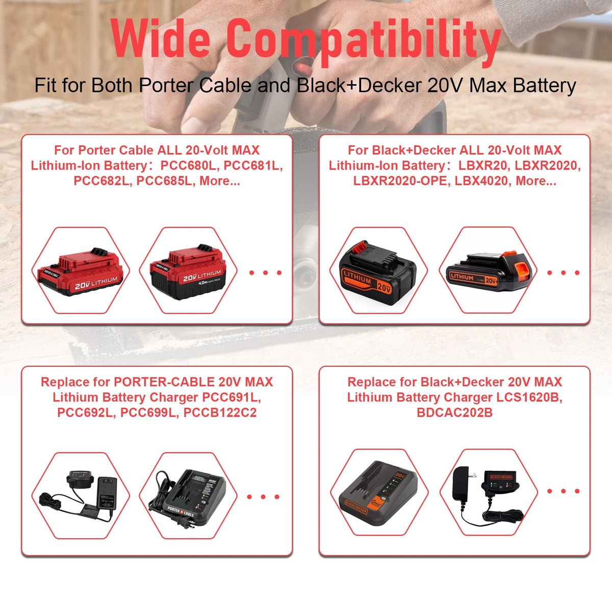 Q: Is the PENGJBATTER PCC692L charger compatible with all 20V batteries?A: The PENGJBATTER PCC692L charger is specifically designed for Black and Decker and Porter-Cable 20V batteries. It is not compatible with other brands of 20V batteries.
