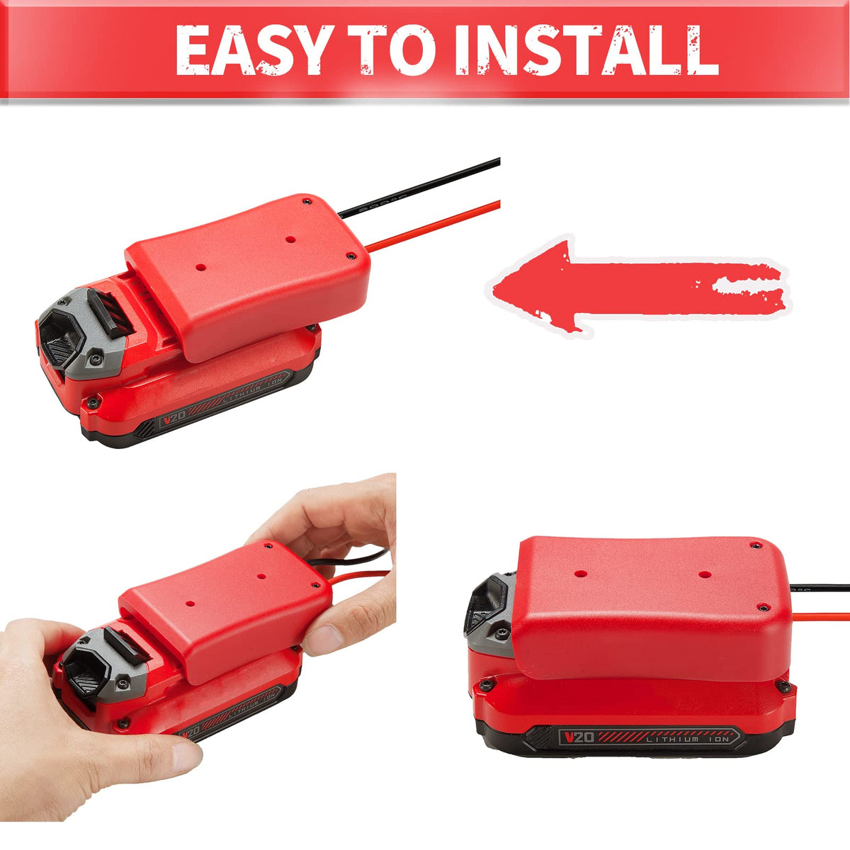 Specifications: 1. Compatible With For Craftsman 20V Li-Ion Battery. 2. Power Wheels Battery Adapter Perfectly Upgrade Your Power Wheel, Robot, Rc Toys, Diy And Other High Power Applications. Let Your Kids Have Nearly Endless Power Wheels Fun. 3. The Red Wire Is Connected To The Positive Terminal, And The Black Wire Is Connected To The Negative Terminal; When Using, The Two Wires Shouldn'T Be In Contact. 4. This Product Is Not A Charger, It Only Outputs Battery Voltage And Power Directly From Your Battery. 5. The Dimension Of The Product Is 3 X2.7 X1 , And The Length Of The Wire Is 12.2 Package List: 1 X Battery Connector 1 X Inline Fuse Holder 3 X 30A Fuse Replacements 1 X Terminal Block