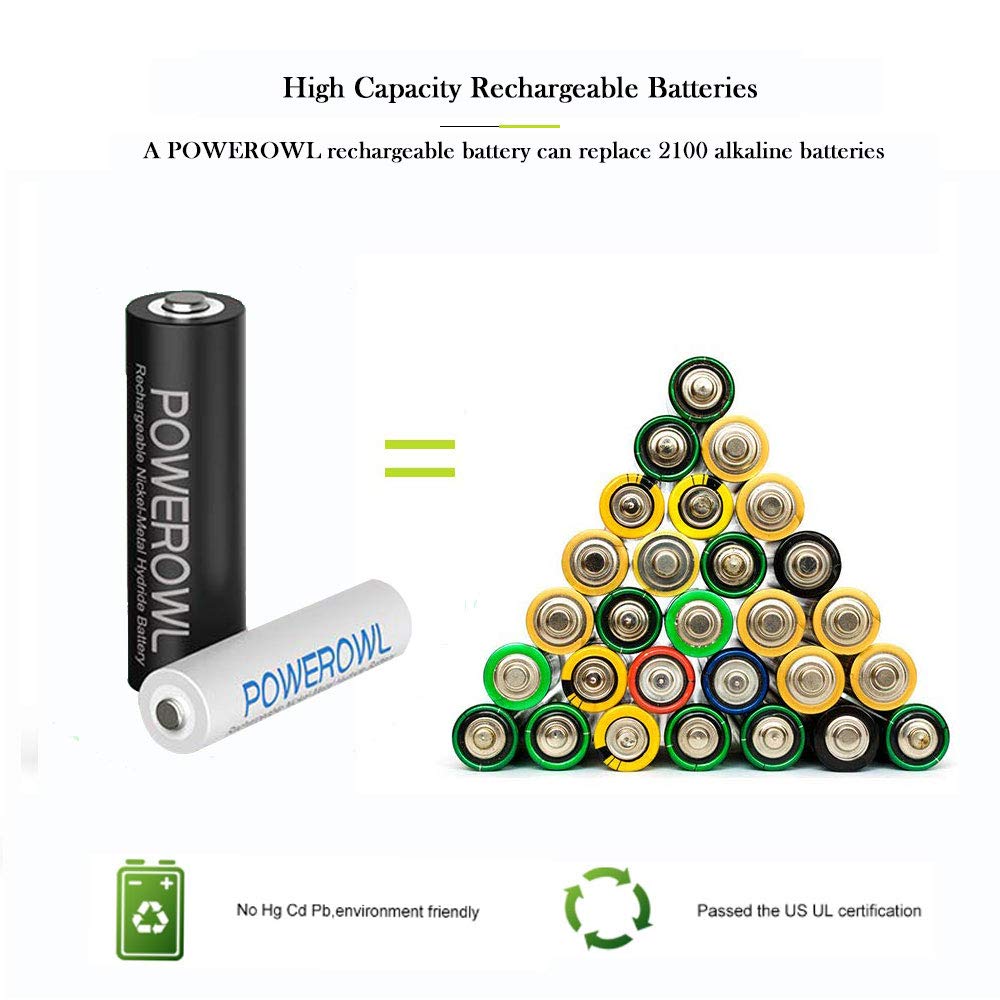 Q: Is the POWEROWL charger compatible with other battery types?A: The POWEROWL charger is specifically designed for AA and AAA rechargeable NiMH batteries. It is not compatible with other battery types such as lithium or non-rechargeable batteries.