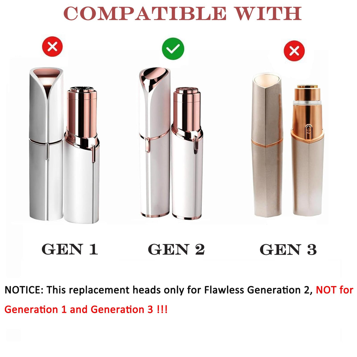 Q: Are these replacement heads compatible with other models of facial hair removers?A: These replacement heads are specifically designed for the Flawless Facial Hair Remover Generation 2. To avoid any compatibility issues, please ensure you are using a Gen 2 model.