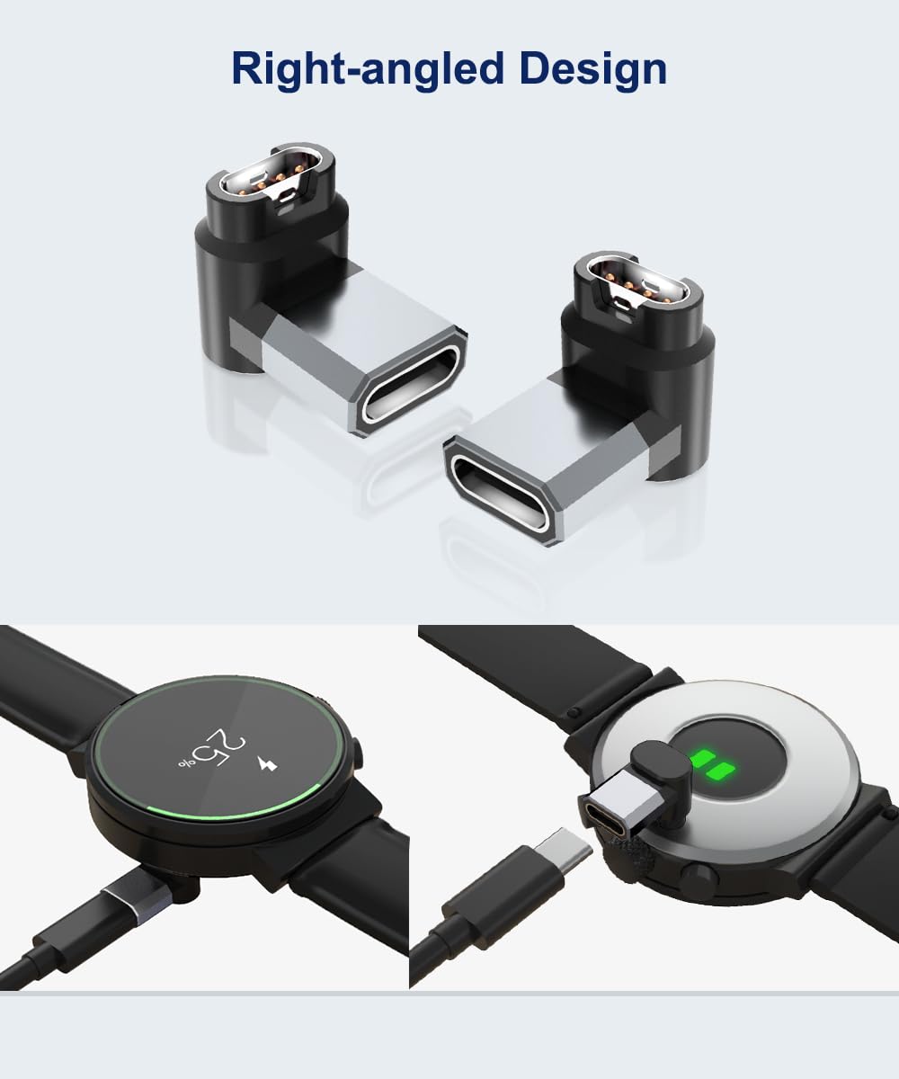 Q: How does the right-angled design benefit my charging experience?A: The right-angled design of the charging connector firmly latches into your Garmin watch's port, preventing disconnection during use. This feature ensures stable data transfer and charging, making it a reliable choice for daily use.