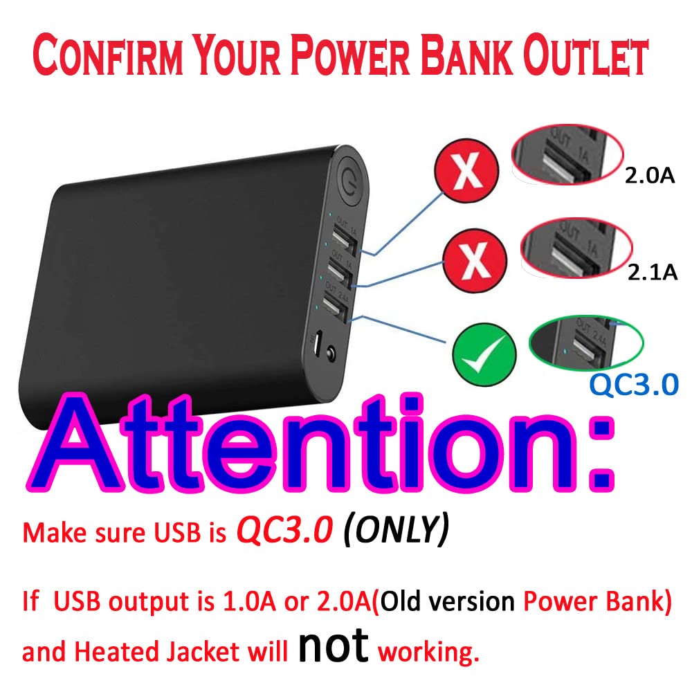 Q: How do I ensure my power bank works with the heated jacket?A: To ensure compatibility, make sure your power bank is a QC3.0 model. If your power bank was made before 2018 and has a USB outlet of 1.0A or 2.0A, it will not be able to power the heated jacket.